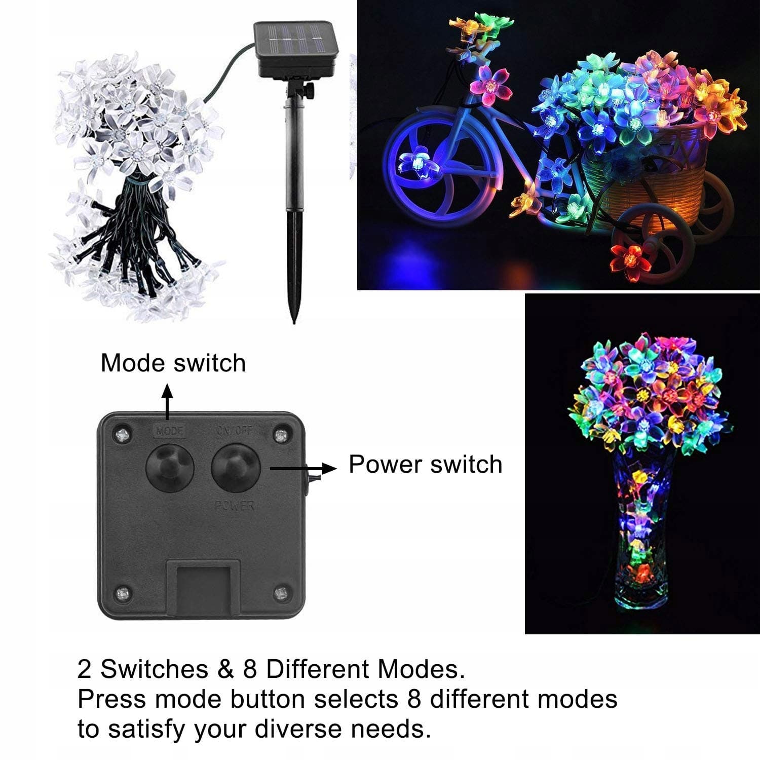 [Udekoruj swoje wspaniałe życie] Stabilne i migoczące. Kwitnące pieszczoty dodają pięknej i urokliwej atmosfery Twojemu ogrodowi, tarasowi, balkonowi, trawnikowi, werandzie, podwórku, ogrodzeniu, bramie, namiotowi, dekoracji weselnej. 2 przełączniki i 8 różnych trybów: Ma przycisk On/Off i przycisk trybu, naciśnij przycisk trybu, aby wybrać 8 różnych trybów, aby spełnić Twoje różne potrzeby.