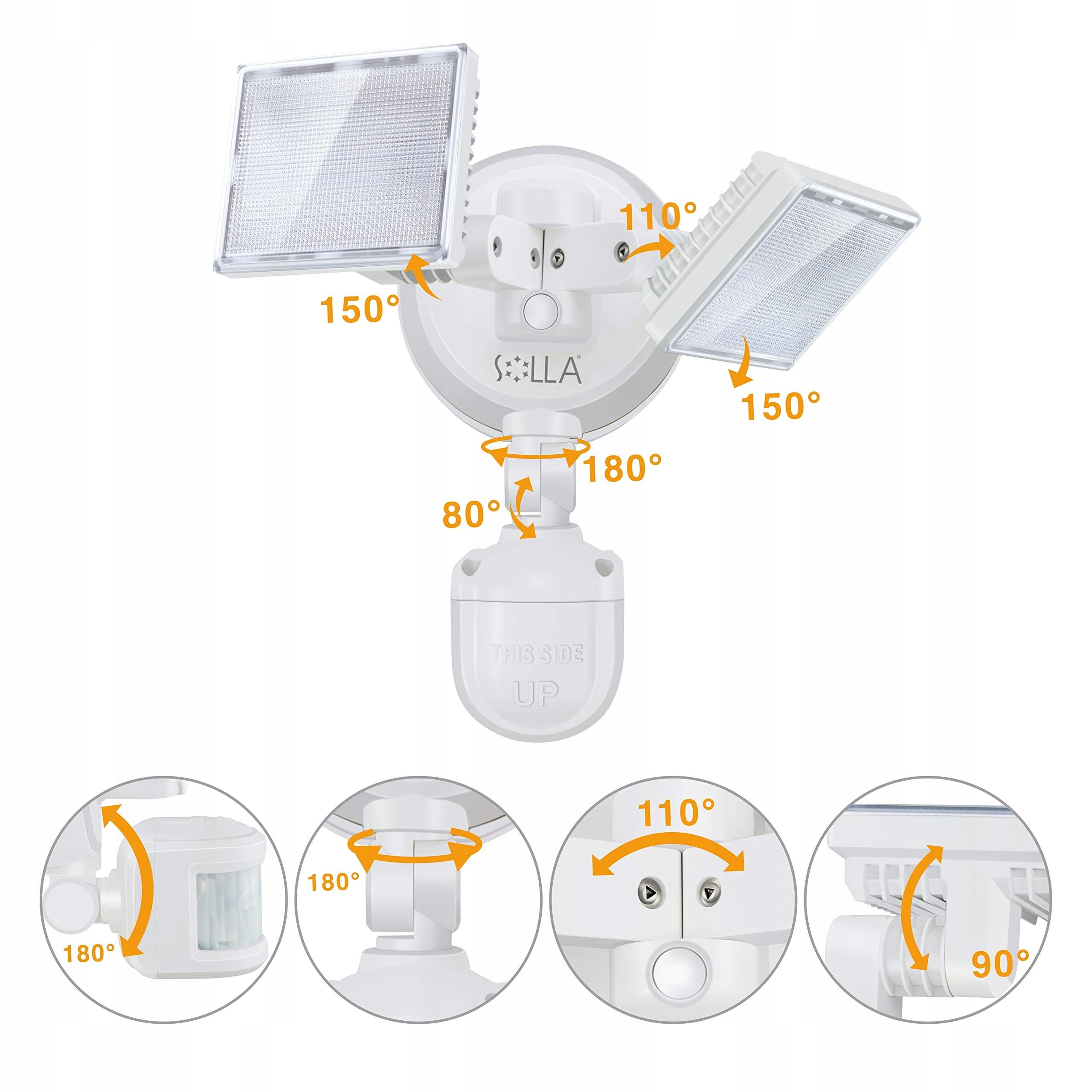 2 regulowane głowice: Kąt każdej lampy zewnętrznej z czujnikiem ruchu można indywidualnie ustawić. Możesz poruszać wszystkimi głowicami światła w górę i w dół (150° pionowo), dwie boczne lampy można także obracać w lewo i prawo (110° poziomo), a czujnik ruchu można obracać o 180° w górę i w dół, aby oświetlić każdy ciemny zakątek.