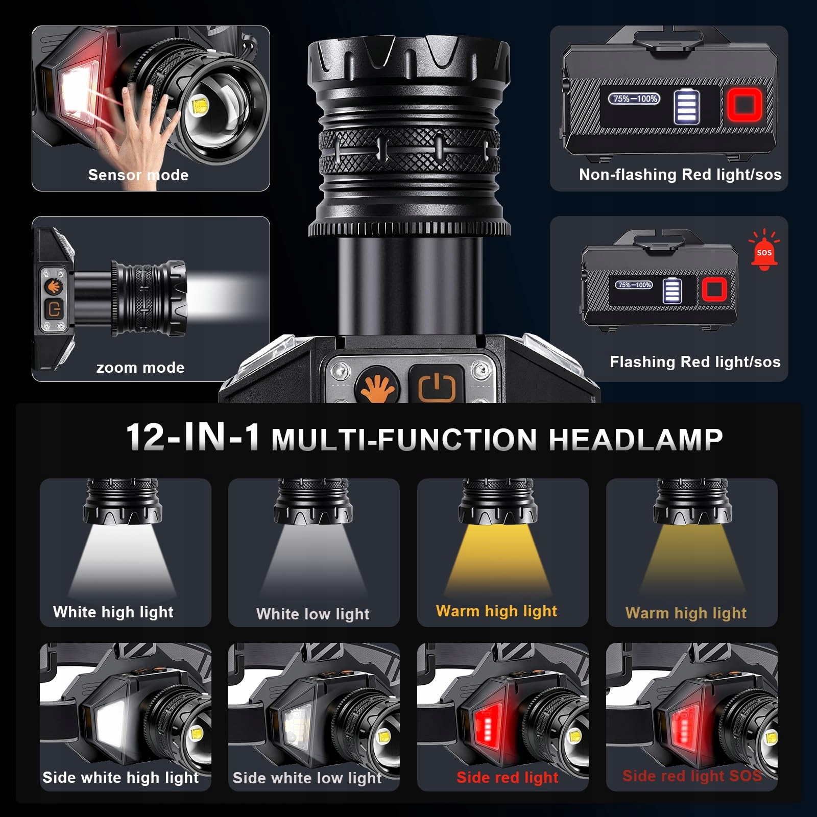 Spardar Latarka czołowa LED wielokrotnego ładowania, super jasna 120000 lumenów, 12 trybów i czujnik, wodoodporna IPX7, regulacja 90°, odpowiednia do różnych zastosowań, takich jak camping, wędkarstwo i polowanie