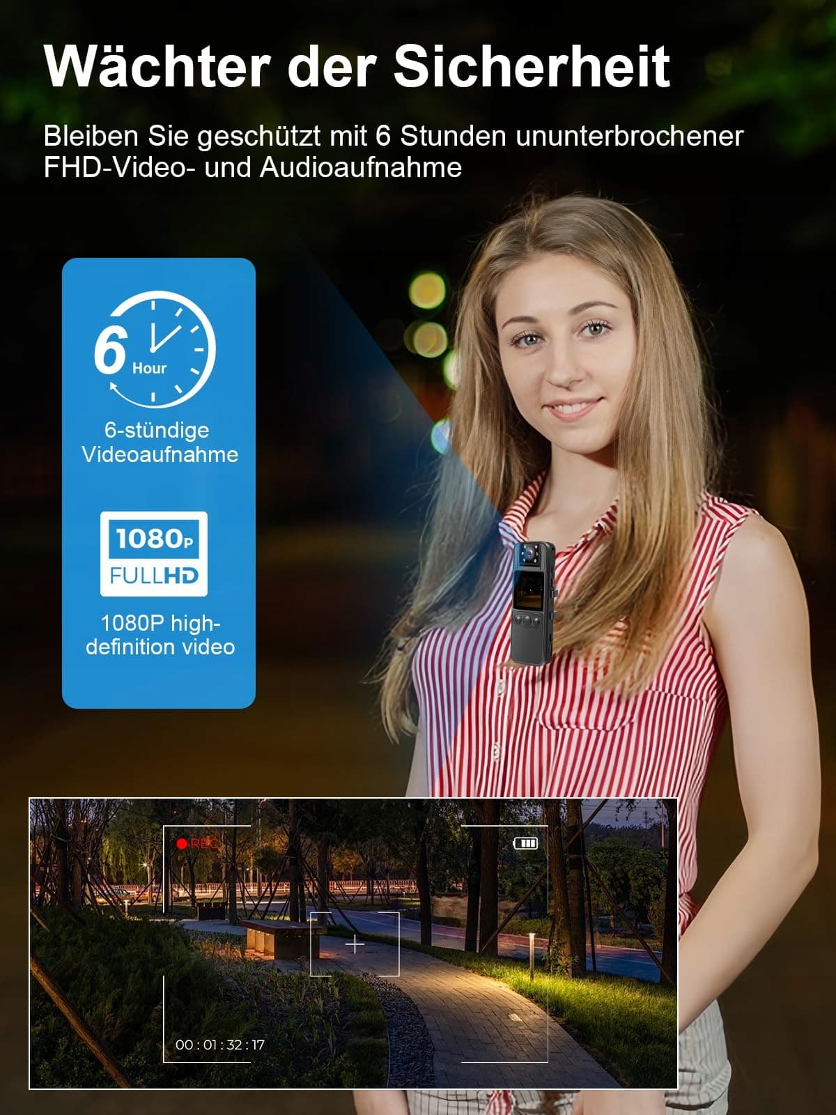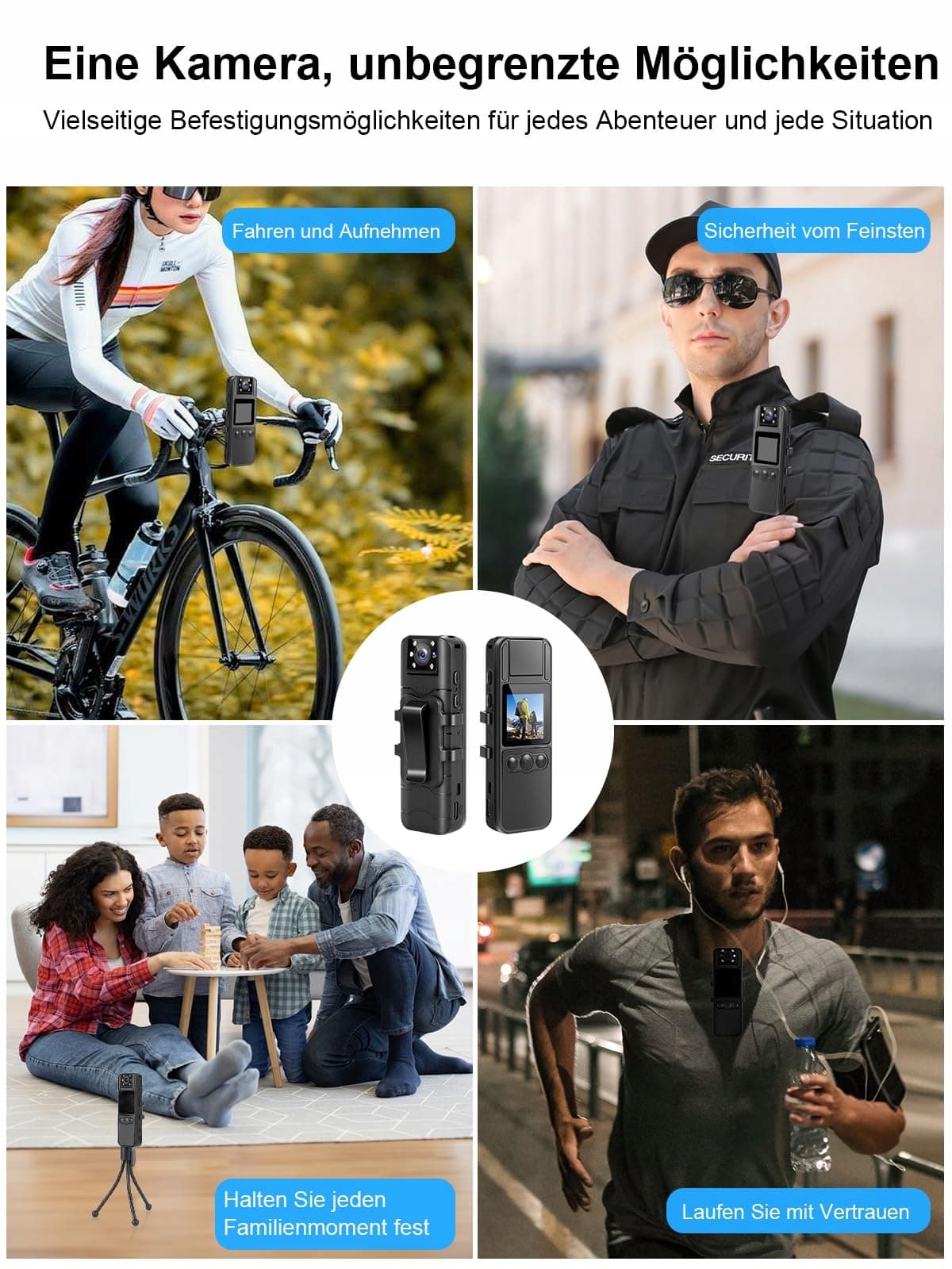 【Elastyczne mocowanie na każdą sytuację】 Niezależnie czy idziesz, jedziesz na rowerze czy jesteś na spotkaniu – dzięki klipsowi z tyłu, smyczy, uchwytowi rowerowemu lub statywowi kamera na ciało może być pewnie i dyskretnie zamocowana. Zapewnia to nieprzerwaną kontrolę w każdej codziennej sytuacji – uchwyt rowerowy jest już w zestawie.