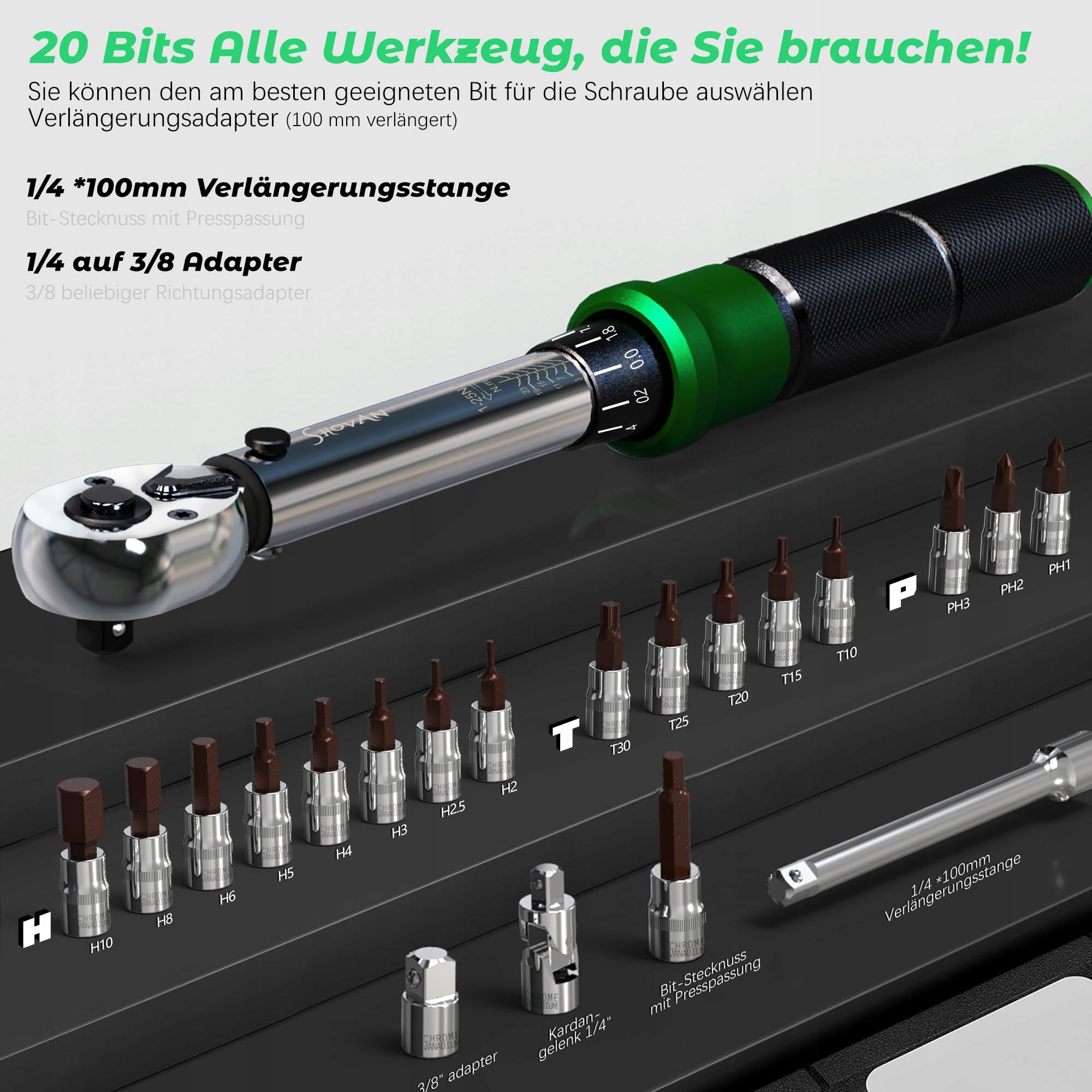SS SHOVAN 21TLG Klucz dynamometryczny do roweru, zestaw nasadek 1/4 cala 2-24 Nm, 72 zęby klucz przełączający, ± 3% dokładność błędu, skrzynka z grzechotką w tym adapter 3/8', bity Phillips, Hex i Torx