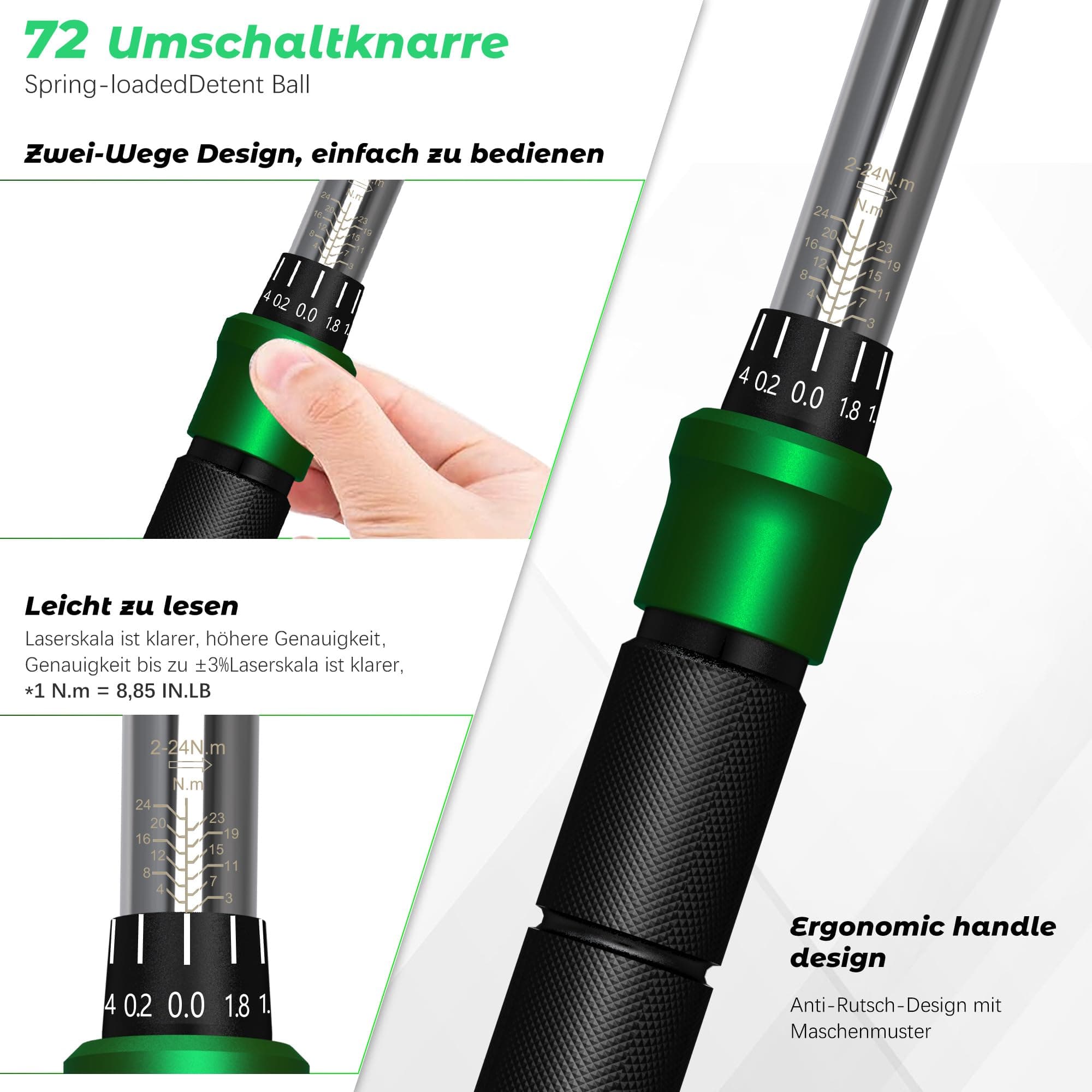 Łatwy w obsłudze - 72 zęby klucz przełączający, w prawo w lewo dwukierunkowe ustawienie. Klucz dynamometryczny jest wyposażony w przycisk szybkiego zwolnienia, który umożliwia łatwe zakładanie i zdejmowanie gniazda. Ustawienie wartości momentu obrotowego - aby zablokować, nacisnąć, ustawić wartość momentu obrotowego, zwolnić, automatyczne zablokowanie wartości momentu obrotowego. Zakres regulacji 2-24Nm, najmniejszy krok 0,2Nm.