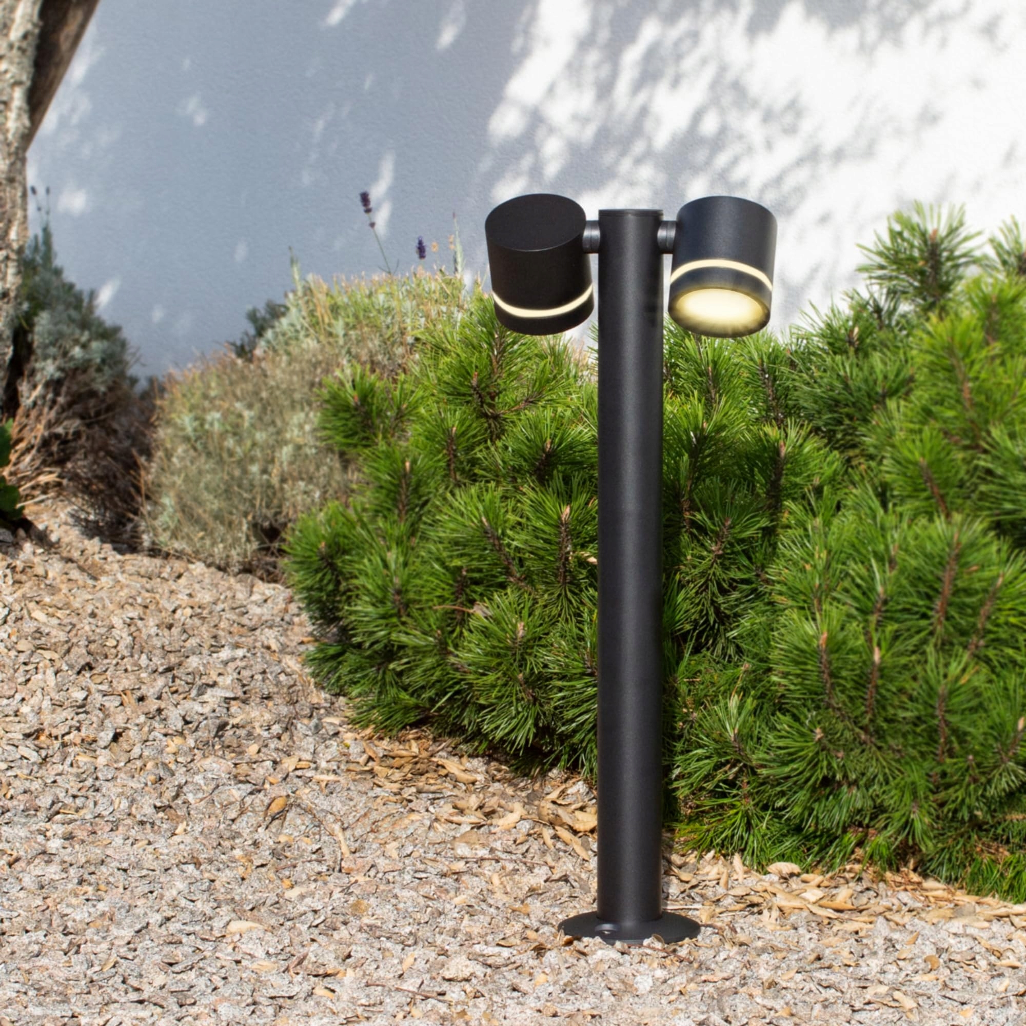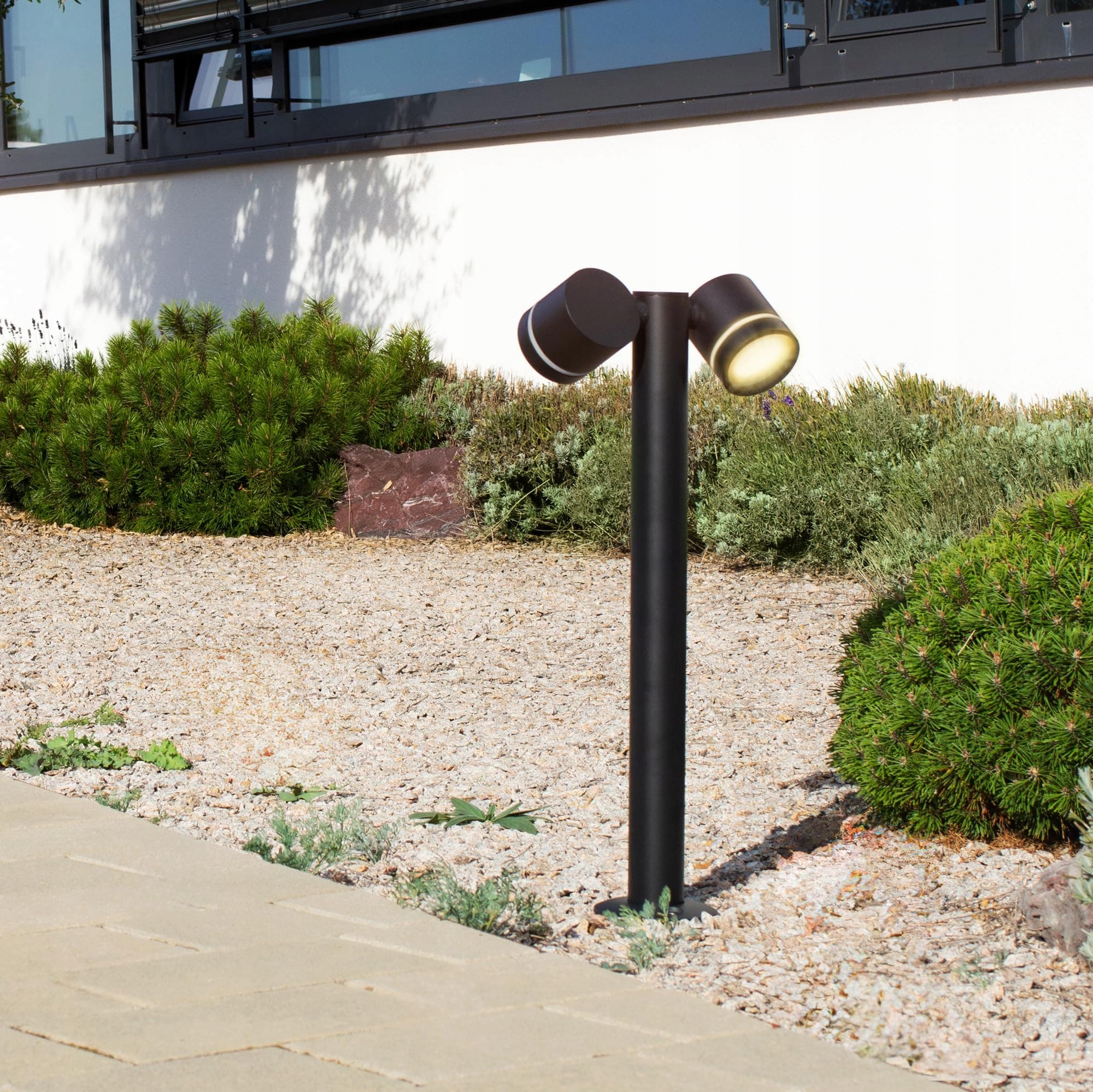 OBROTOWE GŁOWICE LAMP: Lampa stojąca na zewnątrz z dwoma elastycznymi reflektorami; idealna do ukierunkowanego oświetlenia ścieżek na zewnątrz lub jako stojąca lampa tarasowa
