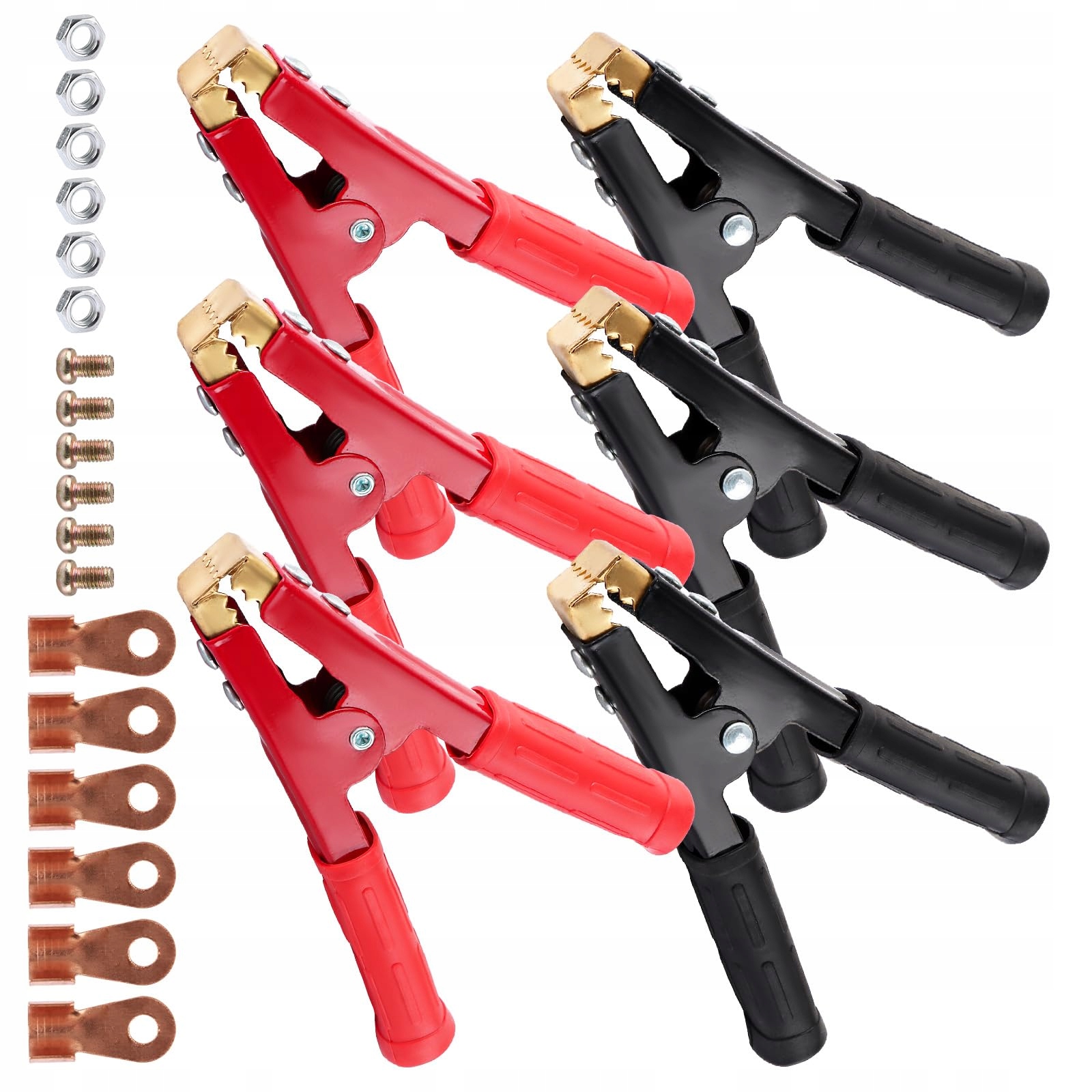 ZESTAW KLESZCZY DO AKUMULATORA CIĘŻARÓWKI: zawiera czerwony zacisk krokodylkowy do akumulatora (plus) i czarny zacisk krokodylkowy do akumulatora (minus). 2*zaciskanie końcówki kabla, 2*śruby i 2*nakrętki.