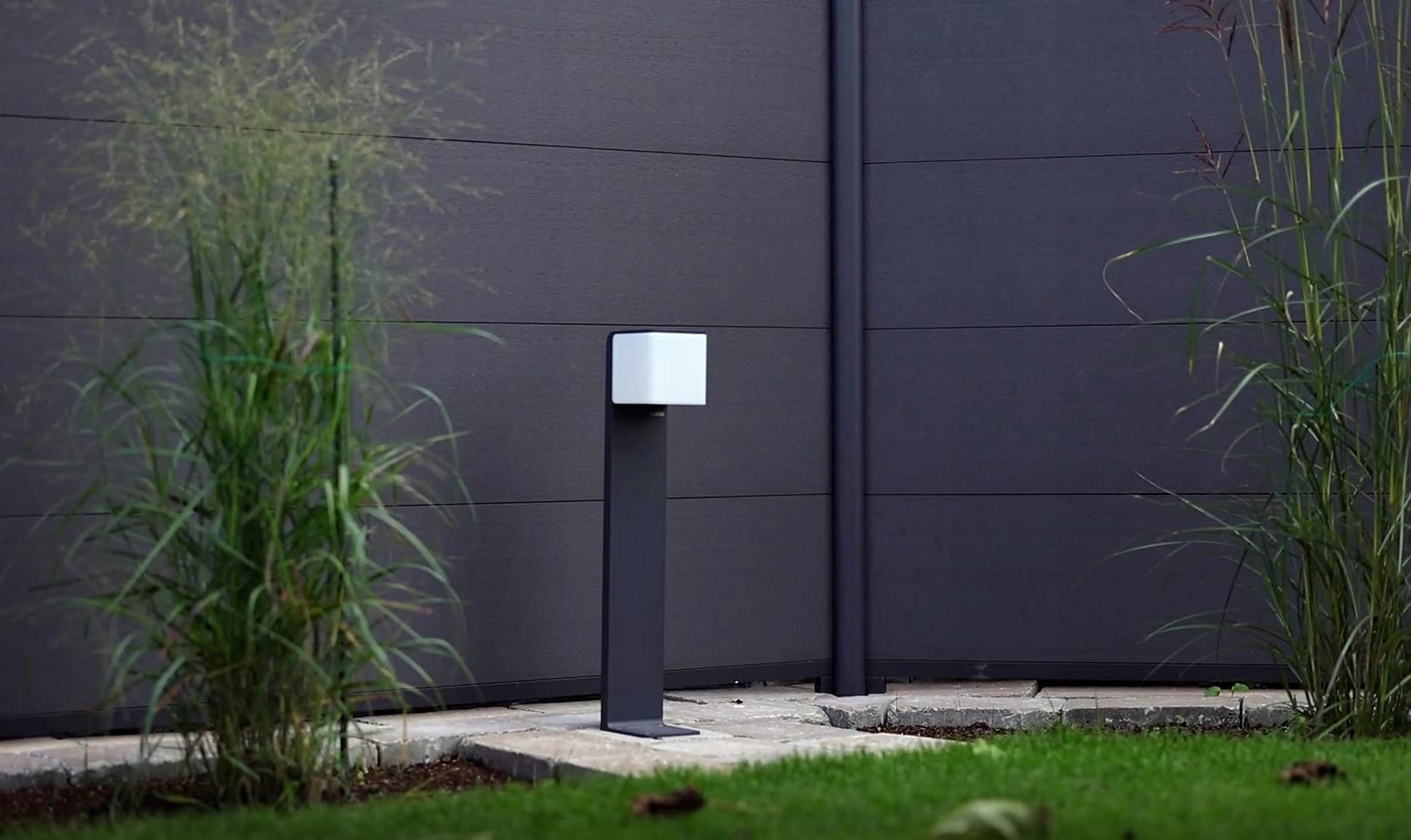 NOWOCZESNA LAMPA SŁUPOWA - Zewnętrzna lampa LED o jasności 650 lm i zużyciu 9,1 W rozprasza przyjemne ciepło-białe światło na ścieżkach, w ogrodzie i na tarasie po zmiennym łagodnym starcie światła