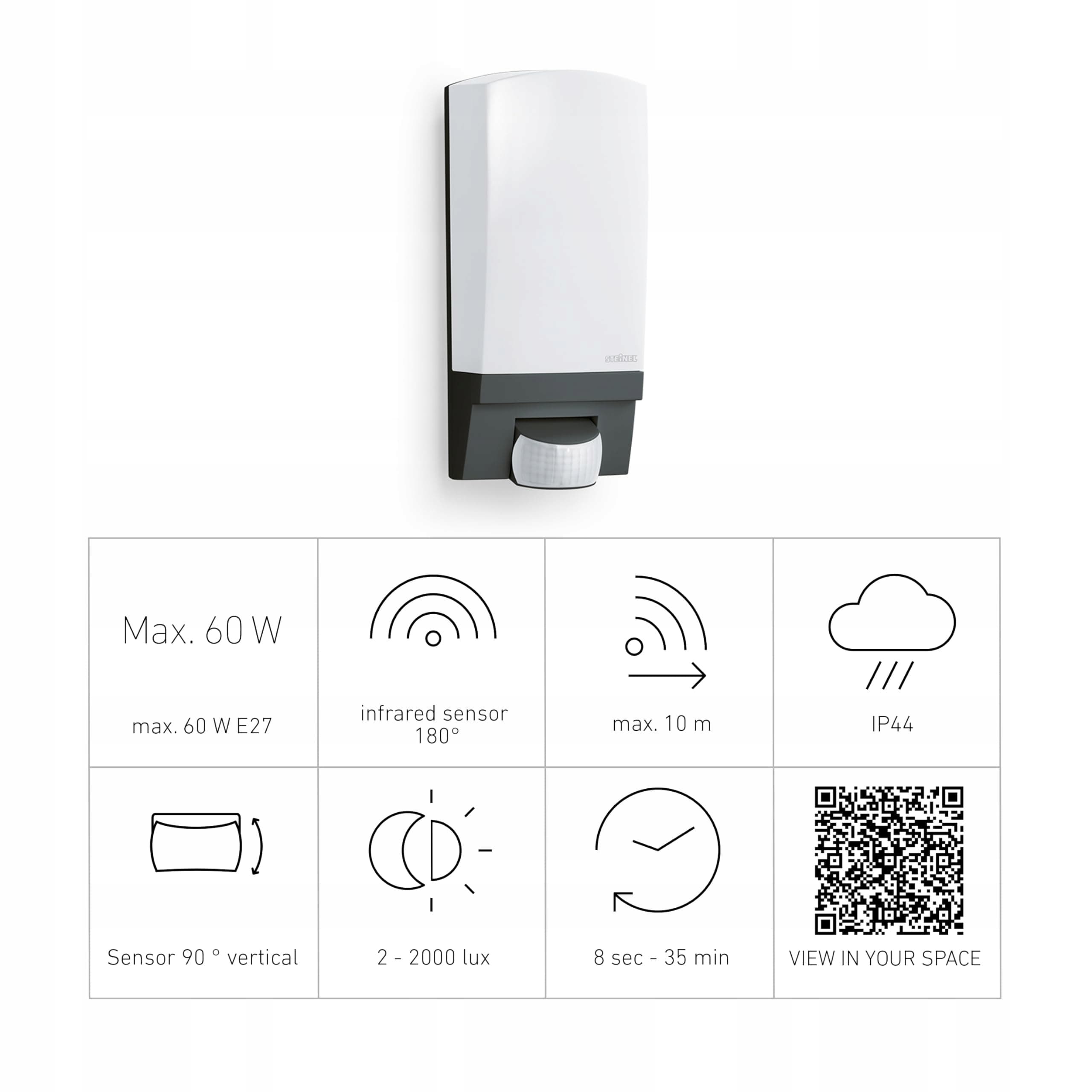 Steinel Lampa ścienna L 1 S czarna, inkl. numer domu, E27, maks. 60 W, lampa ścienna zewnętrzna, czujnik ruchu 180°, zasięg 10 m, biały/okazały ogród