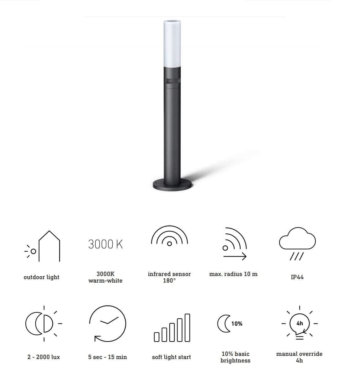 Wysokiej jakości lampa słupkowa z 575 lm ciepłego białego światła przy zużyciu tylko 8,7 W, idealna do ścieżek, ogrodu, tarasu i długich podjazdów