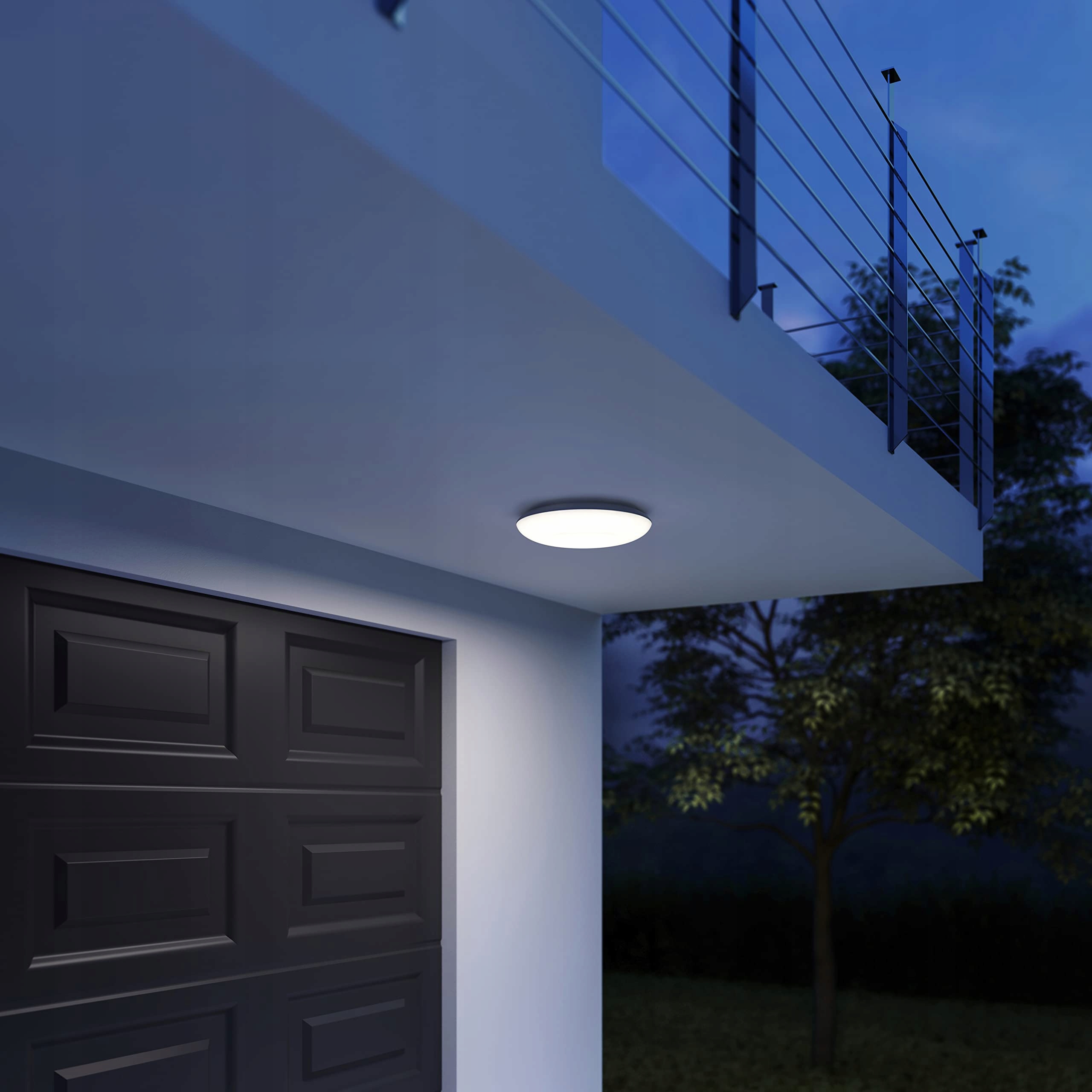 LED lampa sufitowa na zewnątrz z miękkim startem światła, opcjonalną funkcją ciągłego świecenia przez 4 h, 10% światła podstawowego i żywotnością do 30 000 godzin LED dla maksymalnego komfortu oświetlenia