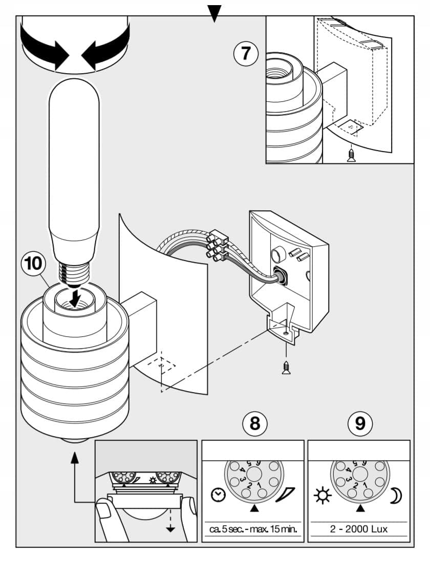 Czujnik podczerwieni 240° z zasięgiem do 12 m niezawodnie włącza światło przy ruchu, czas świecenia (5 s – 15 min.) i czujnik zmierzchu (2 – 2000 lx) można regulować