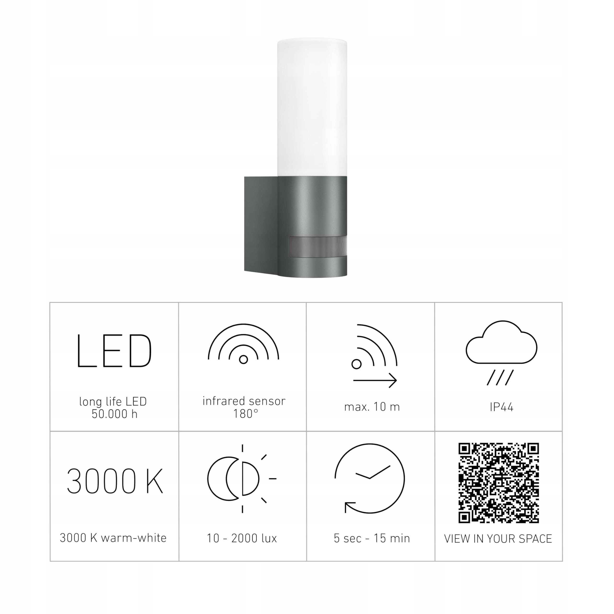 Lampa zewnętrzna wyposażona jest w czujnik podczerwieni o kącie 180° i zasięgu 10 m