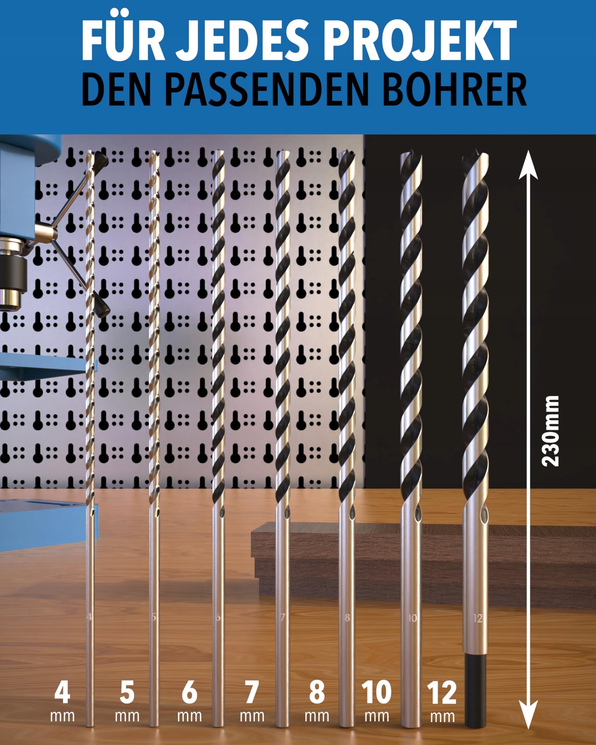STONE REEF Zestaw wierteł do drewna długich Profi - [7-częściowy w tym torba] - wiertła spiralne Ø 4mm, 5mm, 6mm, 7mm, 8mm, 10mm, 12mm x 230mm, długie wiertła do form, wiertła do belek, długie wiertła spiralne do drewna, wiertła długie
