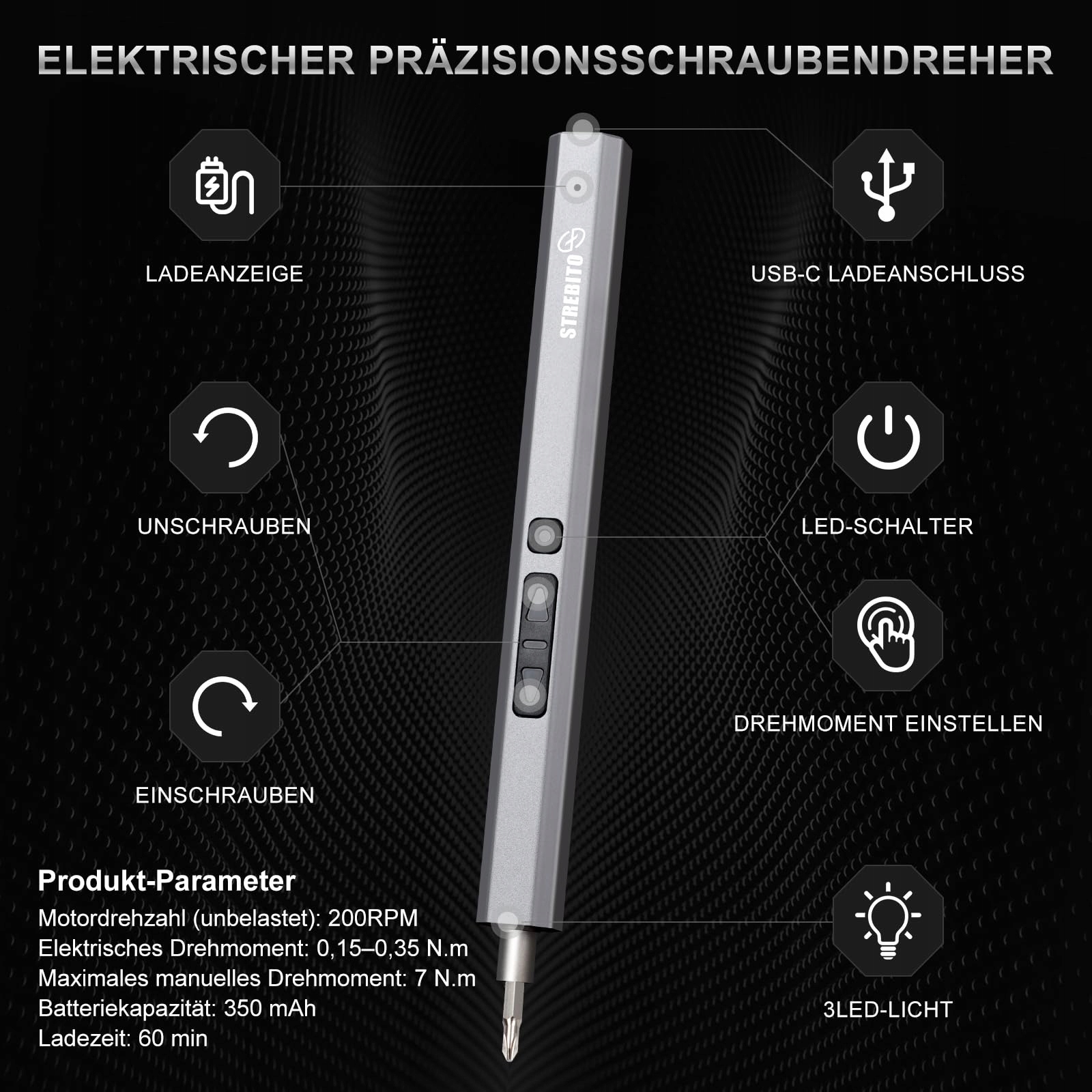 Trwały zestaw narzędzi: STREBITO to zaufana marka w branży narzędzi i majsterkowania. Ten zestaw precyzyjnych wkrętaków elektrycznych jest odpowiedni dla majsterkowiczów. Jeśli masz jakiekolwiek problemy ze swoim wkrętakiem elektrycznym, nasz zespół obsługi klienta jest zawsze do Twojej dyspozycji
