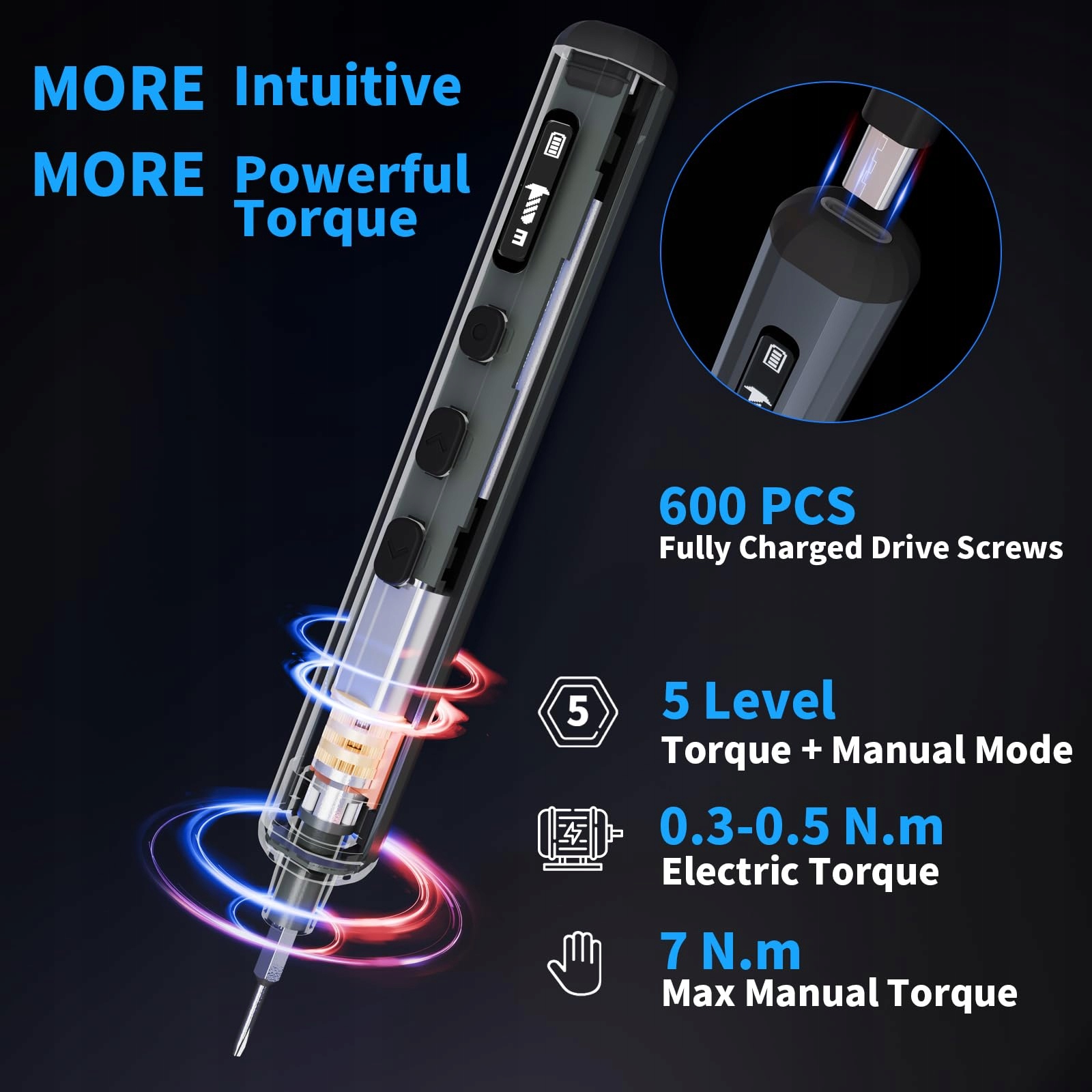 5 ulepszonych momentów obrotowych: Nasza mini-elektryczna wkrętarka STREBITO jest wyposażona w automatyczny moment obrotowy z 5 biegami, który wynosi od 0,3 do 0,5 N·m, i wspiera ręczny moment obrotowy do 7 N·m. Ulepszony wyświetlacz cyfrowy pomaga w precyzyjnych naprawach elektronicznych.