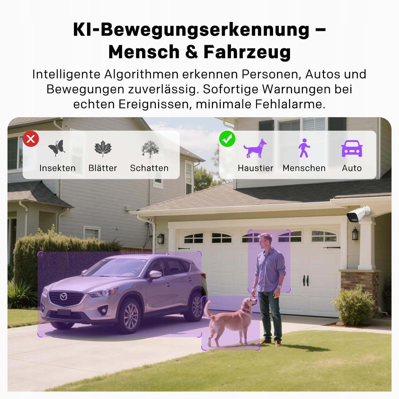 【Sztuczna inteligencja do wykrywania ruchu, osób i pojazdów】Inteligentne algorytmy precyzyjnie rozróżniają ludzi, samochody i ruch – dla natychmiastowych powiadomień i mniejszej liczby fałszywych alarmów.