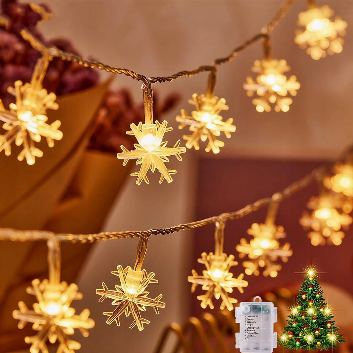 🎄 8 różnych trybów światła: Girlanda świetlna płatki śniegu oferuje 8 różnych trybów światła, w tym kombinację, fale, światło stałe, powolne włączanie i wyłączanie, sekwencję, tryb polowania/błysku, migotanie/błyskanie oraz światło ciągłe. Za pomocą przycisku na obudowie baterii możesz wygodnie przełączać tryby i ustawić pożądaną atmosferę.