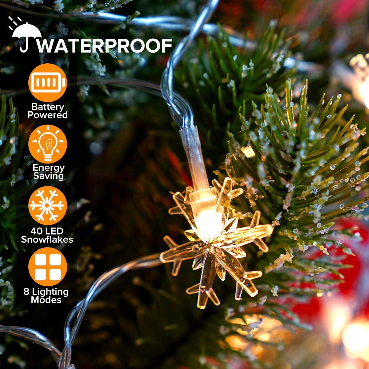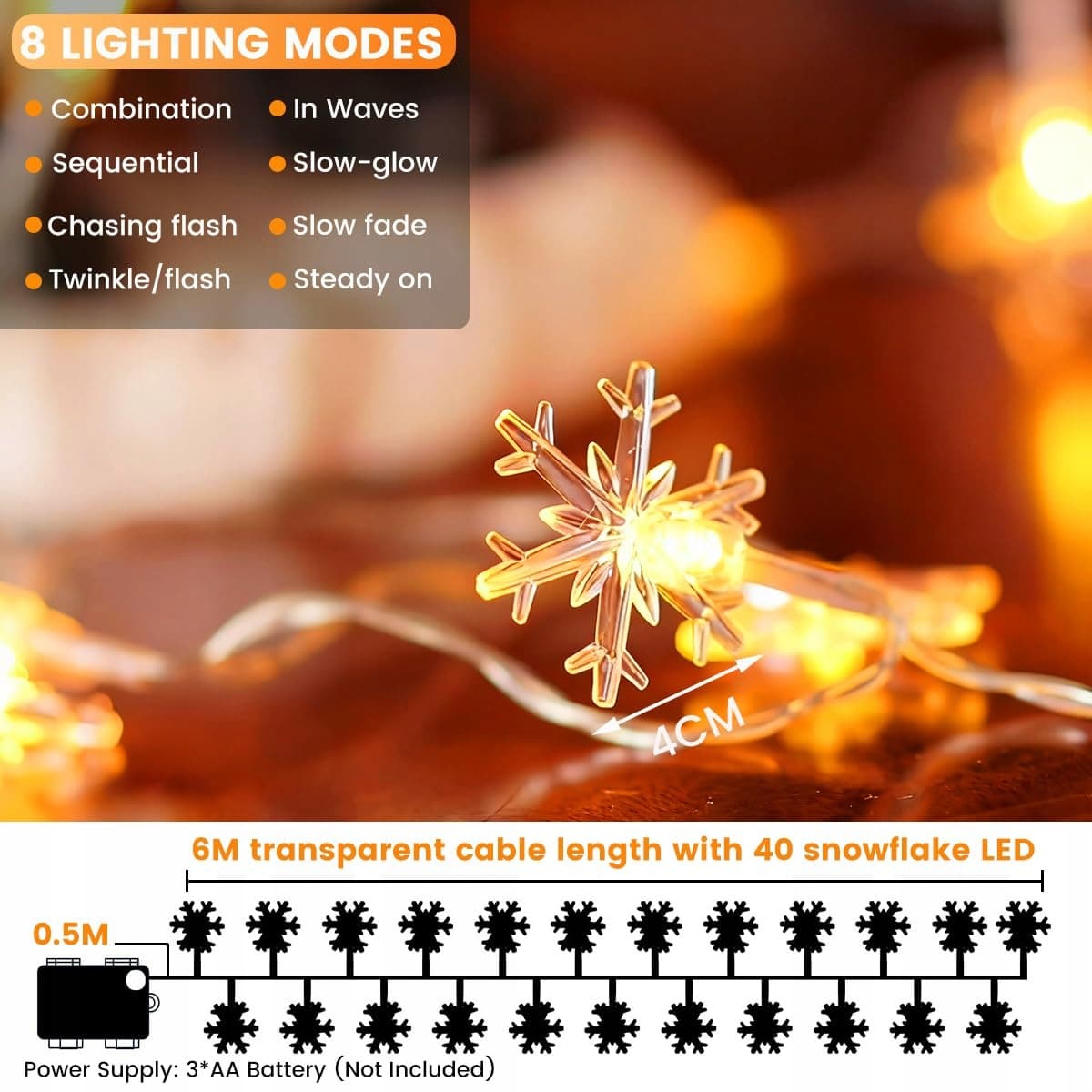🎄 Girlanda świetlna płatki śniegu z 40 diodami LED i długością 6 metrów: Girlanda świetlna płatki śniegu to idealna dekoracja na każdą okazję. Dzięki 40 diodom LED i 8 różnym trybom światła łatwo dopasowuje się do różnych nastrojów i scenariuszy. Dzięki wodoodpornej obudowie na baterie o klasie IP65 jest elastyczna w użyciu. Kąt oświetlenia 360° i płatki śniegu o wielkości 4 cm sprawiają, że światło rozchodzi się we wszystkich kierunkach. To idealny wybór do użytku wewnętrznego.