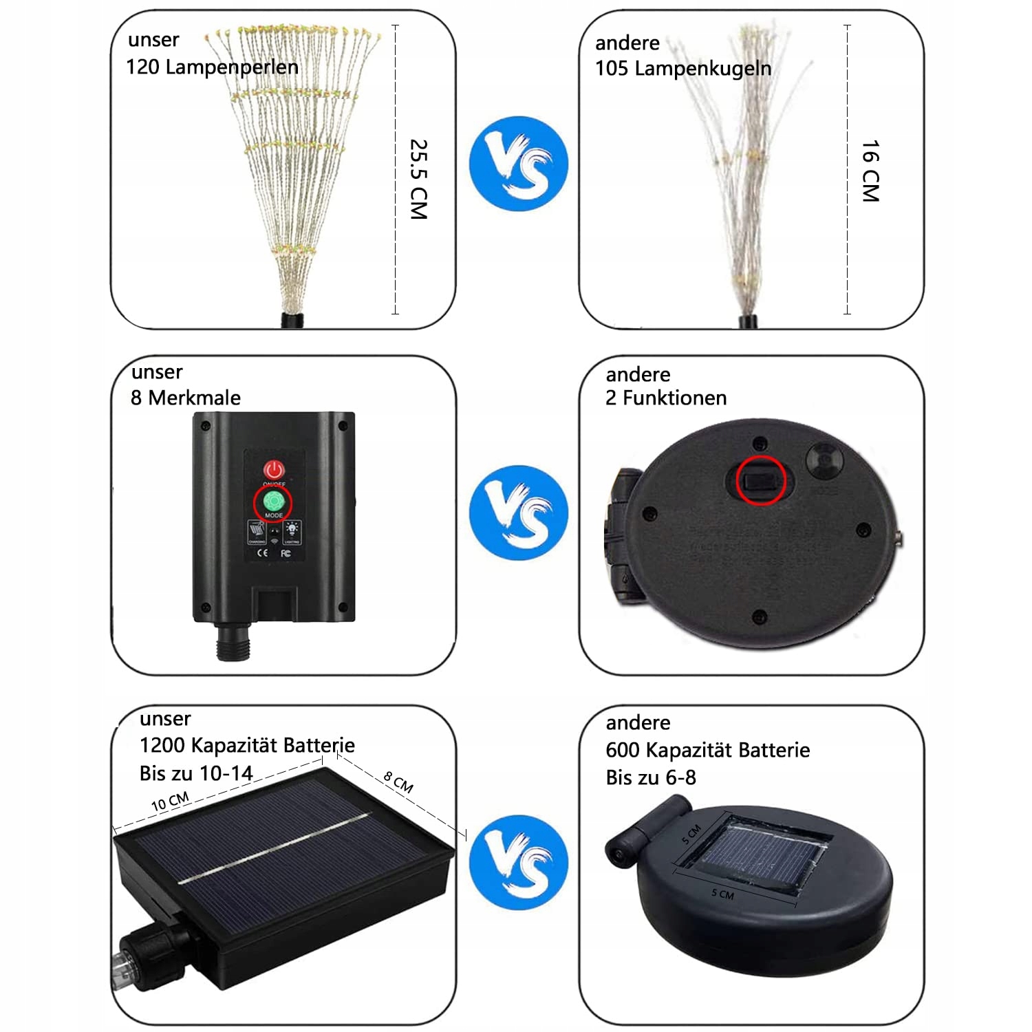 Sunlisky Lampa Solarna do Ogrodu, Zestaw 4 Lamp 120 LED 1200 mAh z Regulacją Czasu i Jasności IP65 (4 Lampiony Sztuczne Ognie) (ciepły kolor)