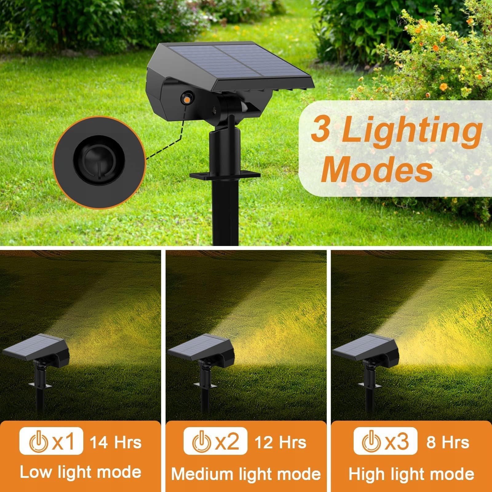 【3 tryby jasności】Zmień tryb oświetlenia za pomocą jednego przycisku, naciśnij przycisk, a światło solarne przełączy się z wyłączonego na tryb słabego światła (14 godzin), następnie na tryb średniego światła (12 godzin), a potem na tryb silnego światła (8 godzin). Dzięki 3 trybom oświetlenia możesz spełnić różne potrzeby.