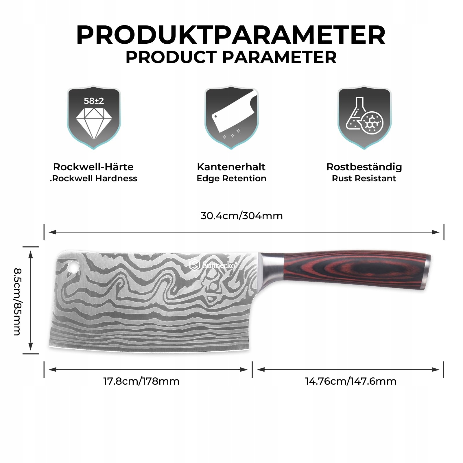 Wszechstronny nóż - Ten nóż to najlepsze narzędzie do krojenia grubego mięsa lub łamania kości. Jednocześnie ten klasyczny siekacz kuchenny o długości 18 cm może być również używany do codziennych prac kuchennych, takich jak siekanie, krojenie mięsa.