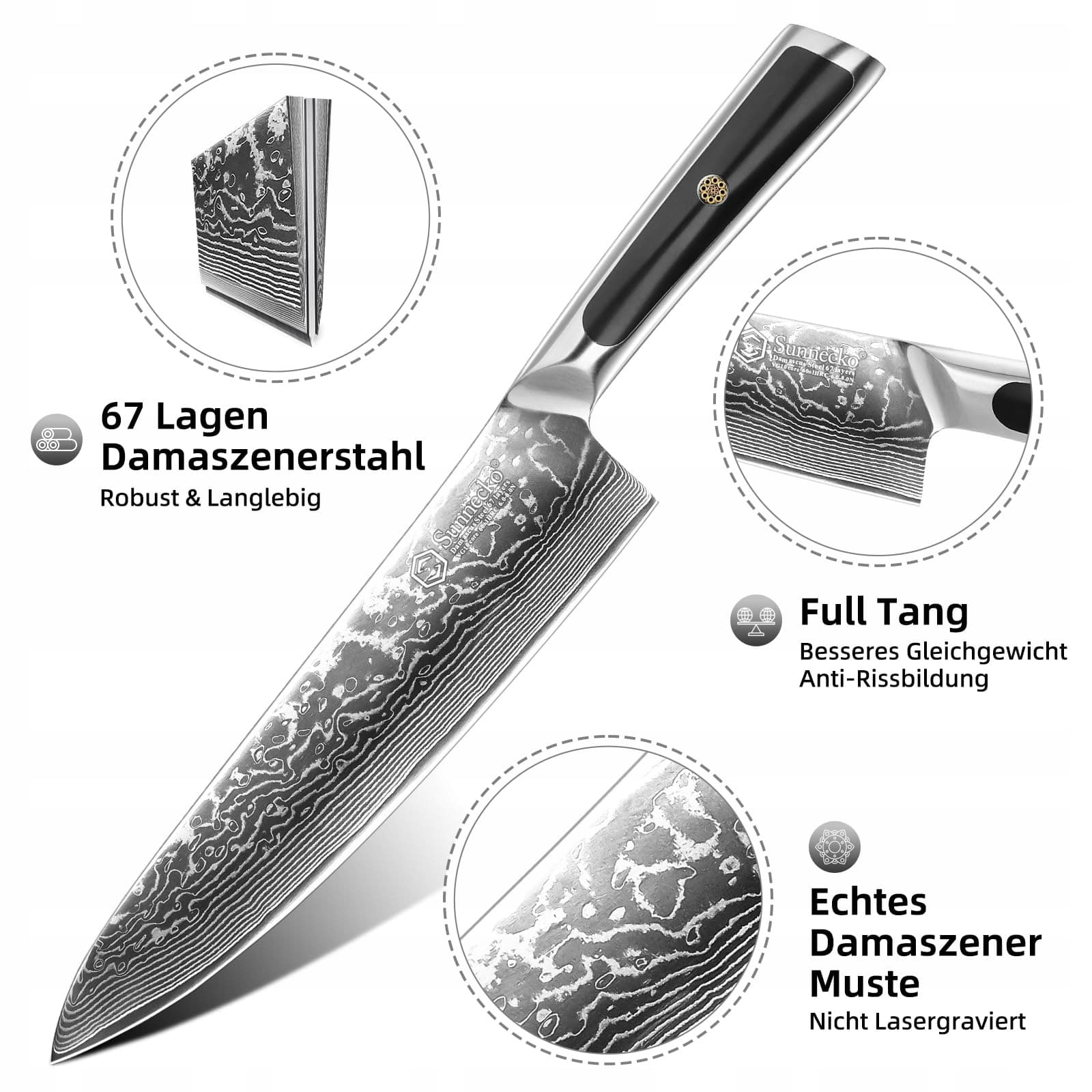 Prawdziwa stal damasceńska - Nasze noże damasceńskie wykonane są z wysokiej jakości, prawdziwej stali damasceńskiej i nie są laserowo grawerowane. Składany wzór damasceński Sunnecko powstaje poprzez wielokrotne składanie i kucie blach stalowych węglowych. To prowadzi do imponującego wzoru ostrza, który po wypolerowaniu wygląda jeszcze piękniej.