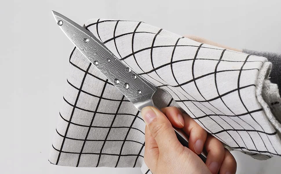 【Prawdziwa stal damasceńska】Nóż kuchenny Damast wykonany jest z japońskiej stali damasceńskiej VG10 o 67 warstwach i wysokiej zawartości węgla. Twardość osiąga HRC60 ± 1 Rockwella. Oznacza to, że noże damasceńskie mają lepszą ostrość, doskonałą trwałość ostrza, odporność na plamy i rdzę w porównaniu do noży ze stali węglowej.
