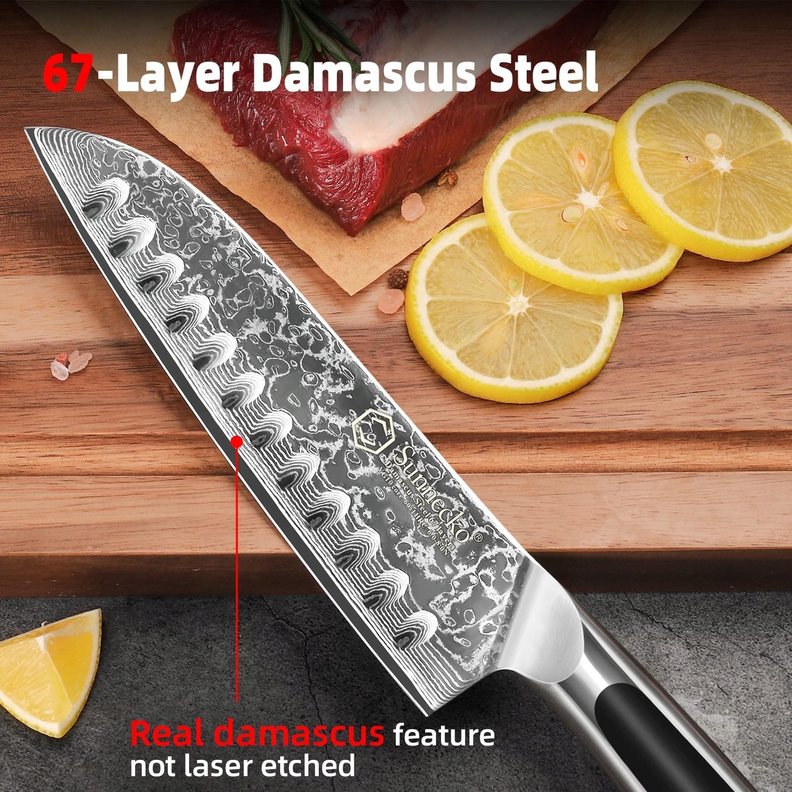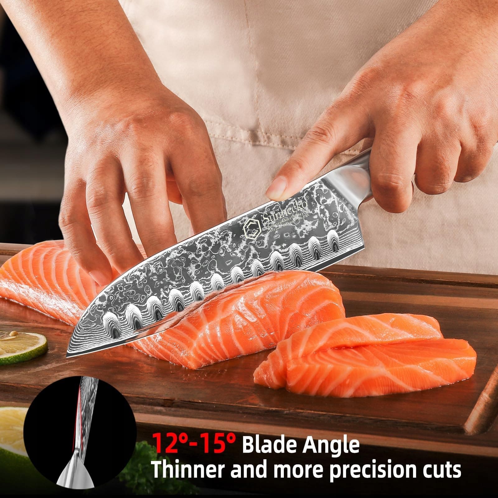 Noż Santoku ma unikalny naturalny wzór, a klingi Sunnecko są ręcznie kute pod kątem 12-15 stopni, co odpowiada optymalnej ostrości noży kuchennych.