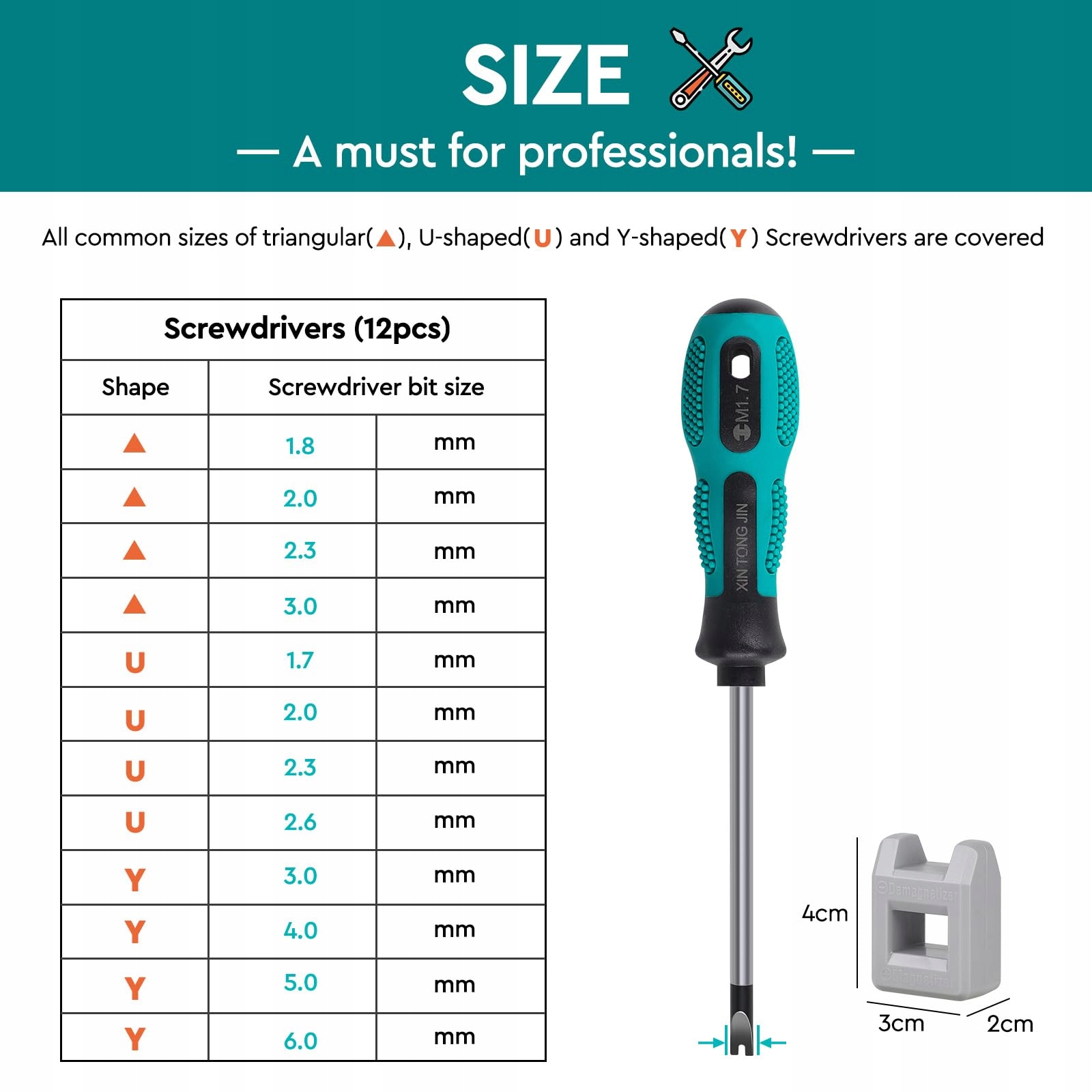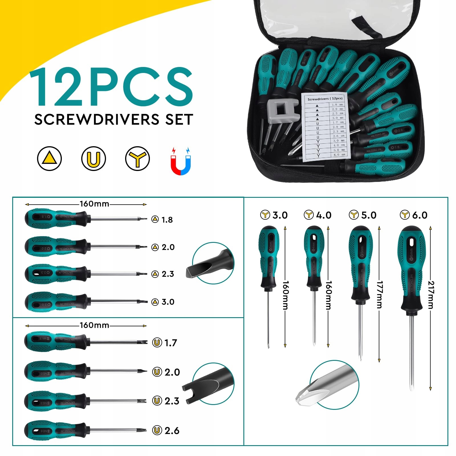 🔌【Wartość za pieniądze】Zestaw 12 profesjonalnych wkrętaków w 3 kształtach i 9 różnych rozmiarach, aby zaspokoić twoje codzienne potrzeby, niezbędne narzędzie do budownictwa, elektryki, mechaniki, inżynierii mechanicznej, majsterkowania, naprawy domowej i dla profesjonalistów. ▲ : 1,8 x 160 mm, 2,0 x 160 mm, 2,3 x 160 mm, 3,0 x 160 mm; U : 1,7 x 160 mm, 2,0 x 160 mm, 2,3 x 160 mm, 2,6 x 160 mm; Y : 3,0 x 160 mm, 4,0 x 160 mm, 5,0 x 170 mm, 6,0 x 220 mm.