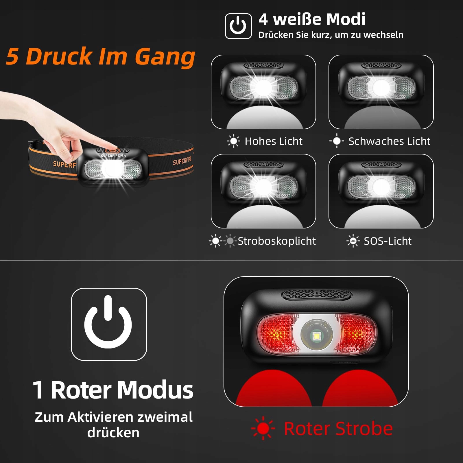 5 trybów światła Latarka czołowa LED Ładowana przez USB: Posiada tylko jeden przycisk do ustawiania 5 trybów. Kliknij, aby włączyć tryby wysokiego-niskiego-błysku-SOS. Podwójne kliknięcie, aby włączyć czerwony błysk (tryby zmieniają się za pomocą przycisku normalnego). Przytrzymaj przycisk przez 3 sekundy, aby go wyłączyć. Podwójne kliknięcie, aby włączyć czerwoną latarkę.