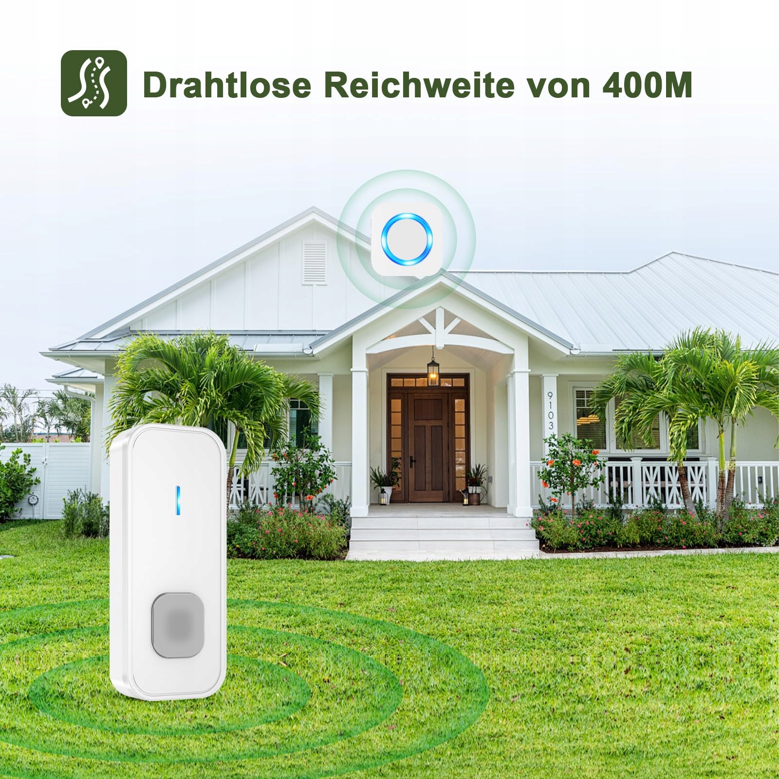 【Silny odbiór, wszędzie】Nasz dzwonek do drzwi oferuje mocny zasięg 400 metrów na otwartych przestrzeniach, dzięki czemu zawsze jesteś osiągalny. Niezależnie od tego, czy jesteś w ogrodzie, na górze w domu, czy nawet w piwnicy, nigdy nie przegapisz odwiedzającego!