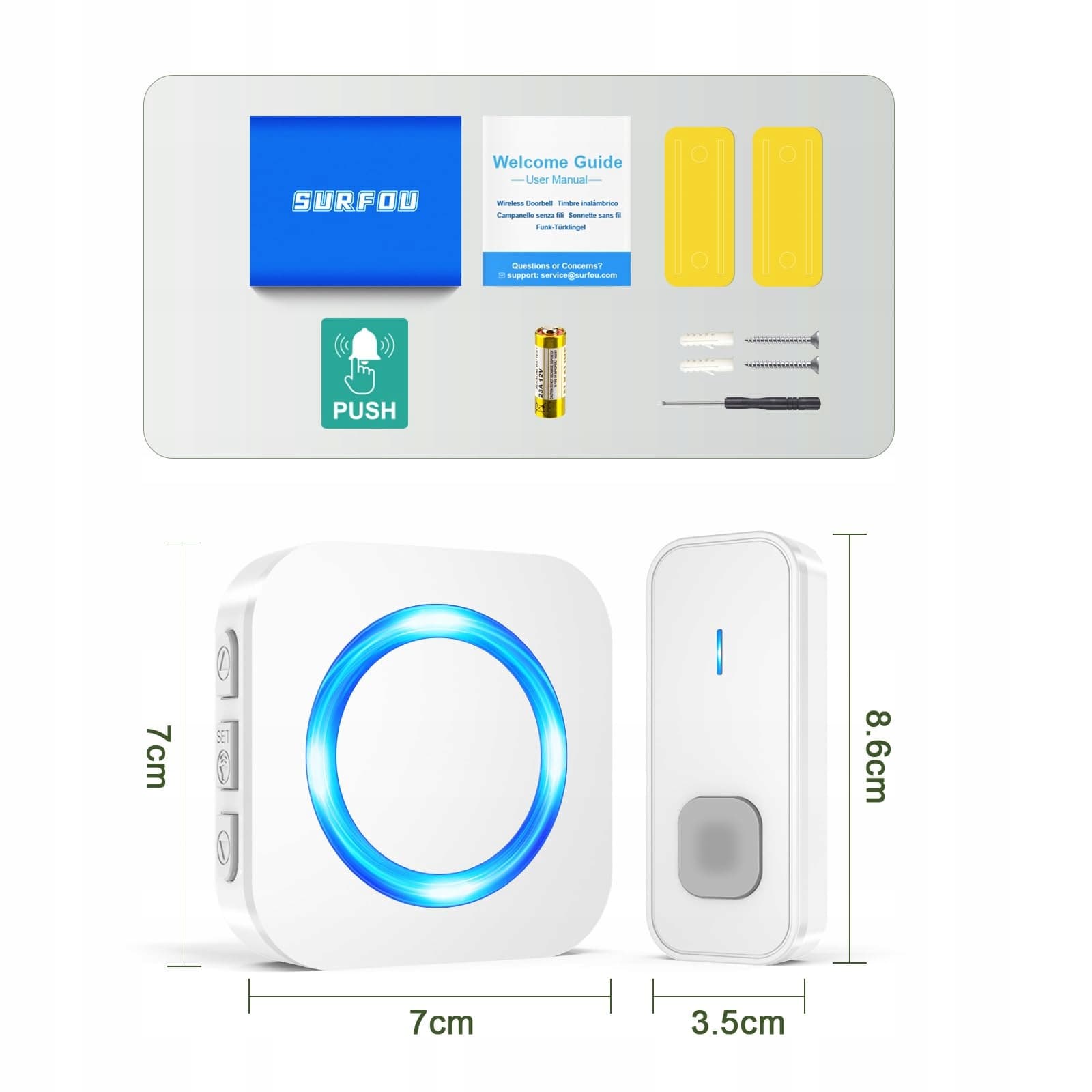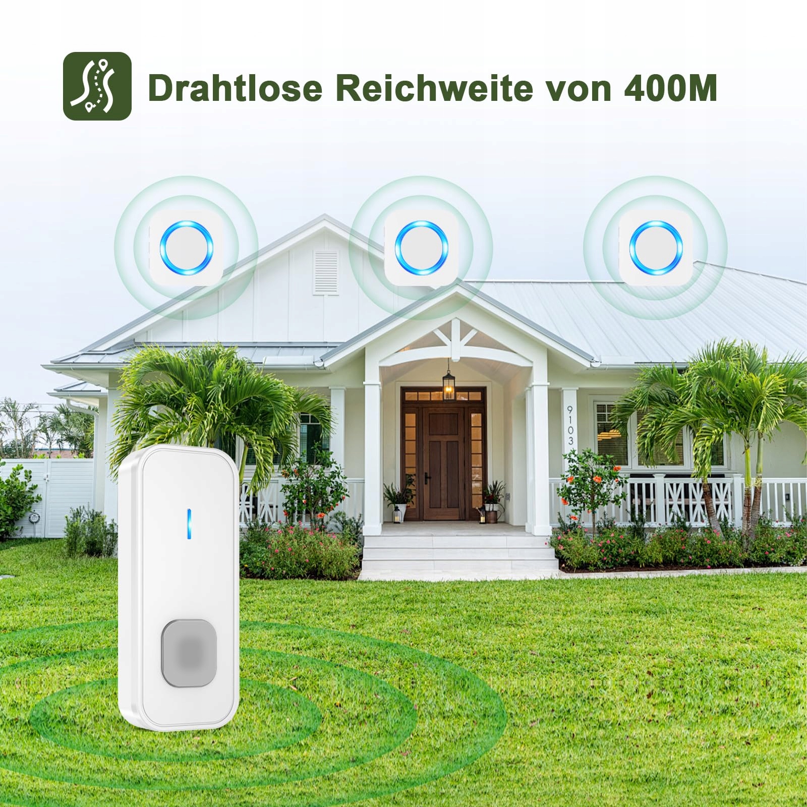 【Silny odbiór, wszędzie】Nasz dzwonek do drzwi oferuje mocny zasięg 400 metrów na otwartych przestrzeniach, dzięki czemu zawsze jesteś osiągalny. Niezależnie od tego, czy jesteś w ogrodzie, na górze w domu, czy nawet w piwnicy, nigdy nie przegapisz odwiedzającego!