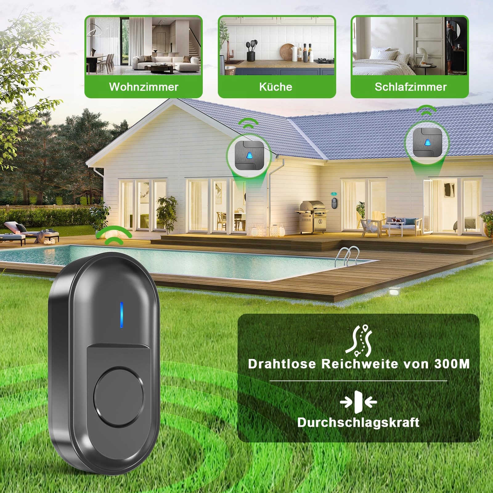 【Silny odbiór, wszędzie】Nasz dzwonek do drzwi oferuje mocny zasięg 300 metrów na otwartej przestrzeni, dzięki czemu zawsze jesteś dostępny. Niezależnie od tego, czy jesteś w ogrodzie, na górze w domu, czy nawet w piwnicy, nigdy więcej nie przegapisz gościa!