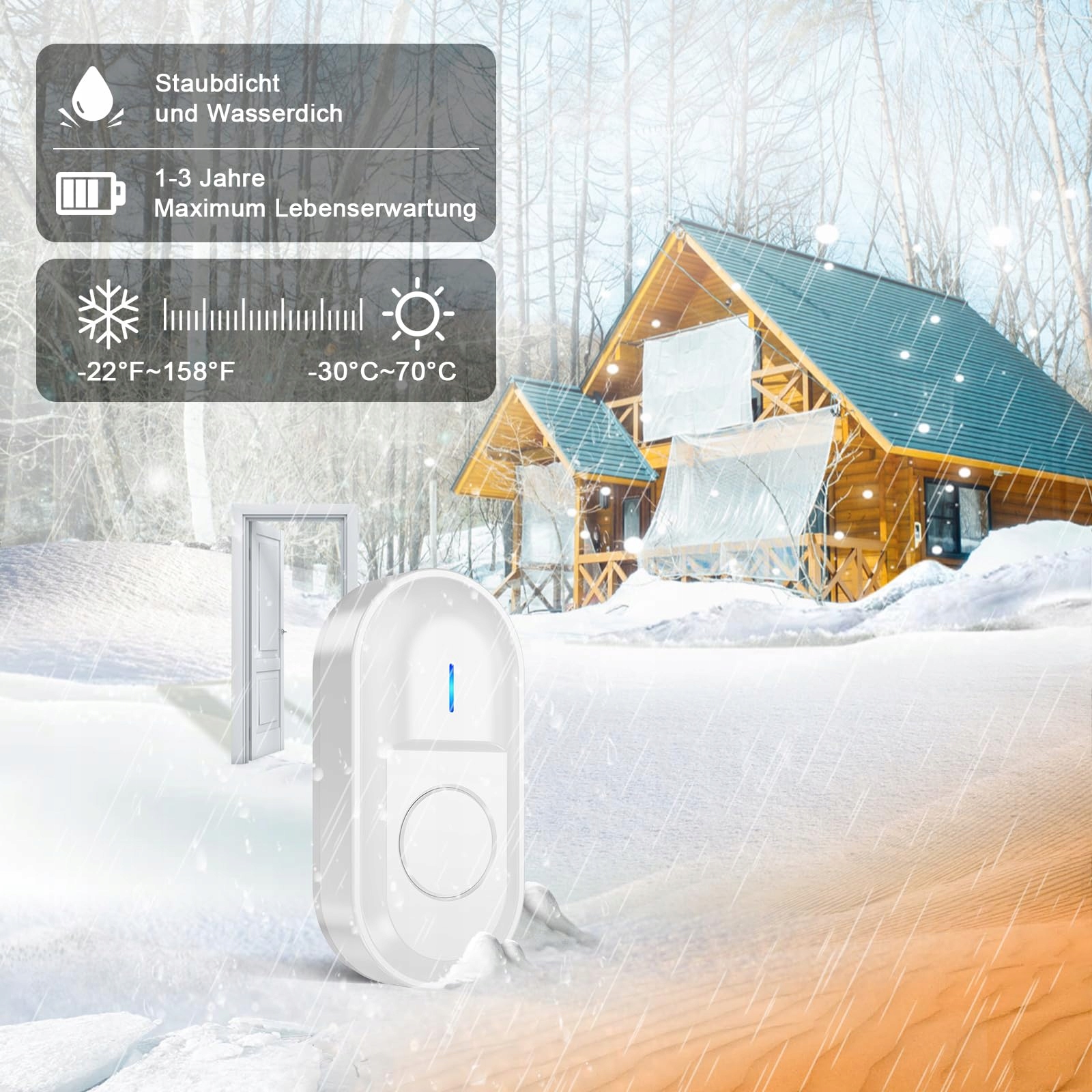 【Wydajność w każdych warunkach】Nasz dzwonek bezprzewodowy jest odporny na kurz i wodę oraz wytrzymuje temperatury od -30°C do 70°C. Stawia czoła trudnym warunkom i charakteryzuje się niezwykle niskim zużyciem energii, co zapewnia długą żywotność baterii.