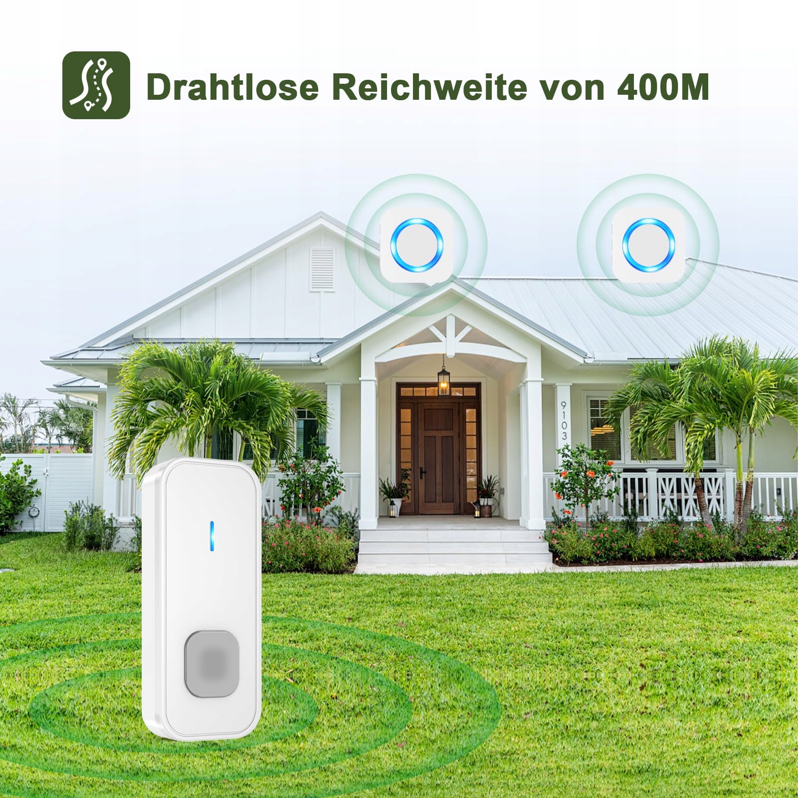 【Silny odbiór, wszędzie】Nasz dzwonek do drzwi oferuje mocny zasięg 400 metrów na otwartych przestrzeniach, dzięki czemu zawsze jesteś osiągalny. Niezależnie od tego, czy jesteś w ogrodzie, na górze w domu, czy nawet w piwnicy, nigdy więcej nie przegapisz gościa!
