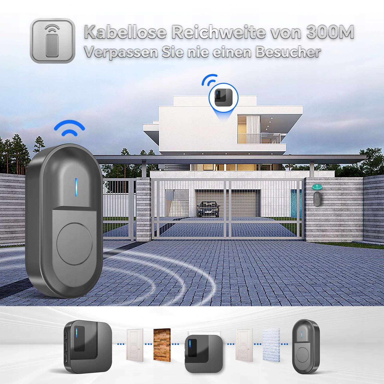 【Silny odbiór, wszędzie】Nasz dzwonek do drzwi oferuje mocny zasięg 300 metrów na otwartej przestrzeni, dzięki czemu zawsze jesteś dostępny. Niezależnie od tego, czy jesteś w ogrodzie, na górze w domu, czy nawet w piwnicy, nigdy więcej nie przegapisz gościa!