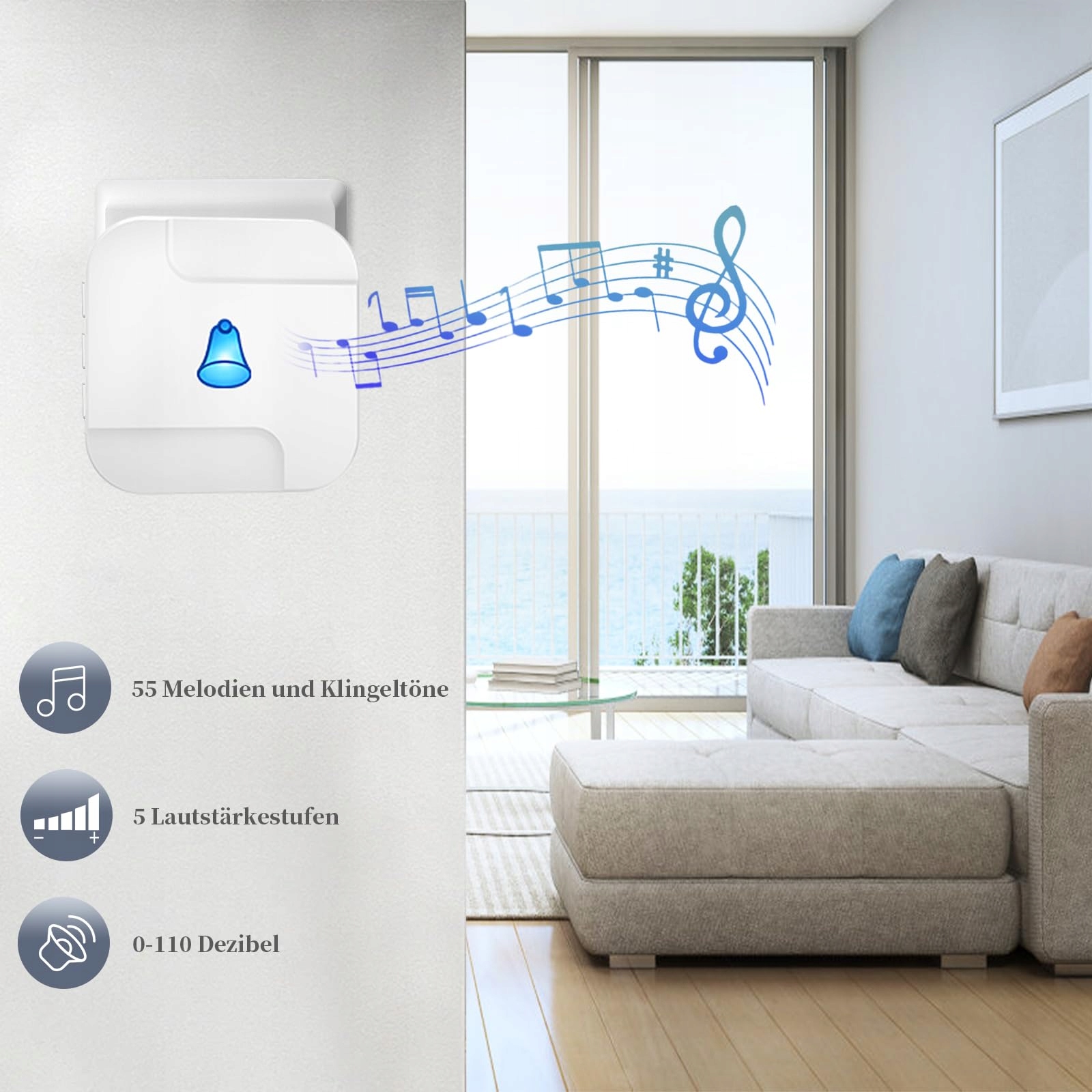 【Indywidualny dźwięk, elastyczne tryby】Ciesz się precyzyjną kontrolą z 5 poziomami głośności do 110 dB, idealnymi dla osób z problemami ze słuchem lub seniorów. Po prostu przełączaj między trybem tylko LED a trybem dzwonka i wybierz spośród 55 melodii dla indywidualnych powiadomień. Twoje ostatnie ustawienia będą zapisywane dla nieprzerwanej wygody.