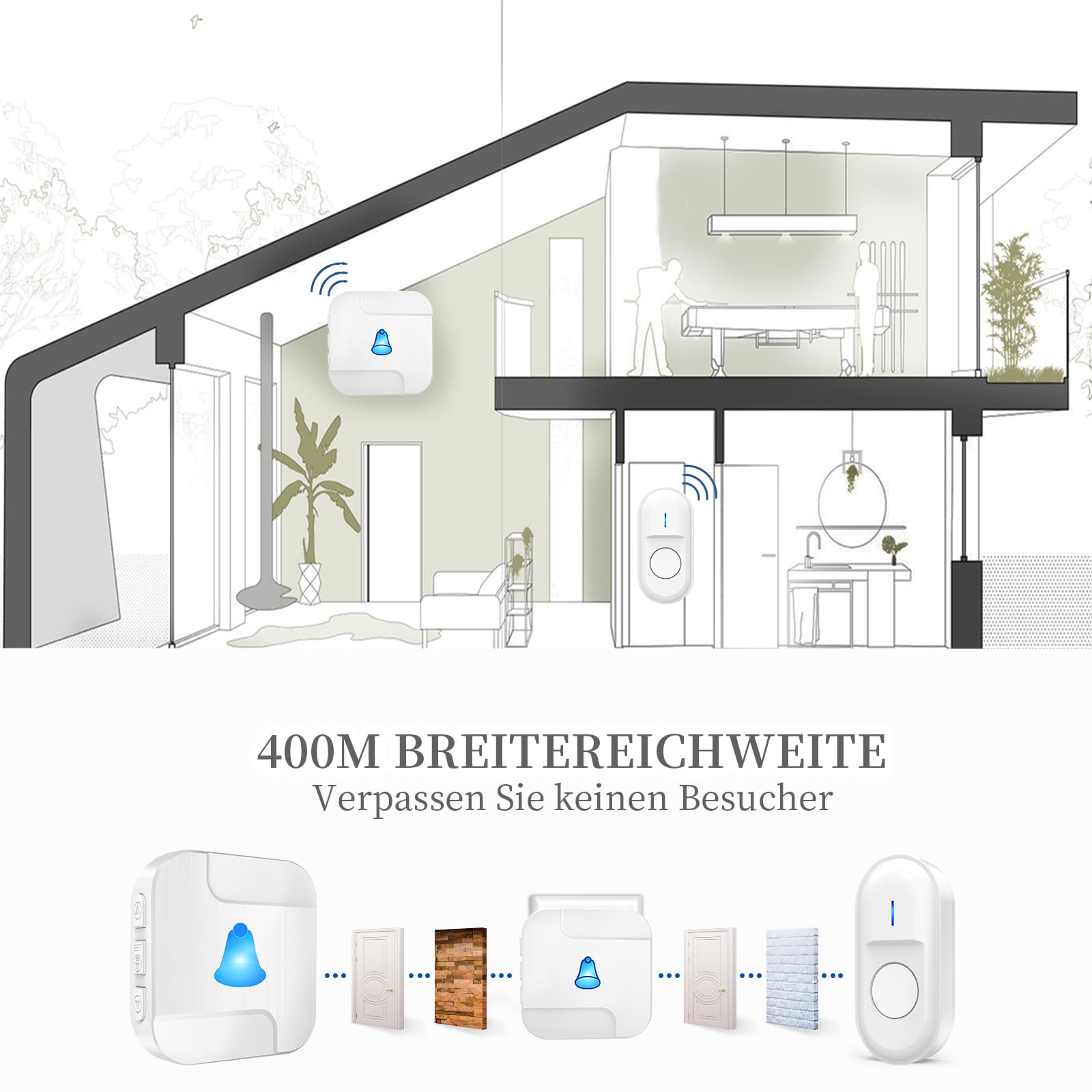 【Silny zasięg, wszędzie】Nasz dzwonek do drzwi oferuje mocny zasięg 300 metrów w otwartych przestrzeniach, dzięki czemu zawsze jesteś dostępny. Niezależnie od tego, czy jesteś w ogrodzie, na górze w domu, czy nawet w piwnicy, nigdy więcej nie przegapisz odwiedzającego!