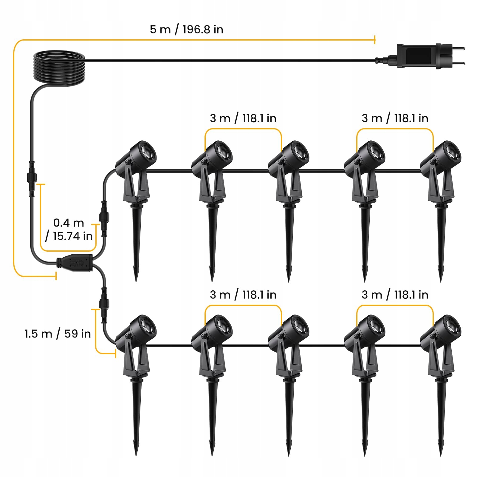 ☞[10-1 Wtyczka 32m]10 reflektorów LED w 1 wtyczce, 5m od adaptera do 1. reflektora. 3m długości między światłami, w pełni pokrywają Twój ogród, idealne do różnych zastosowań oświetlenia zewnętrznego.