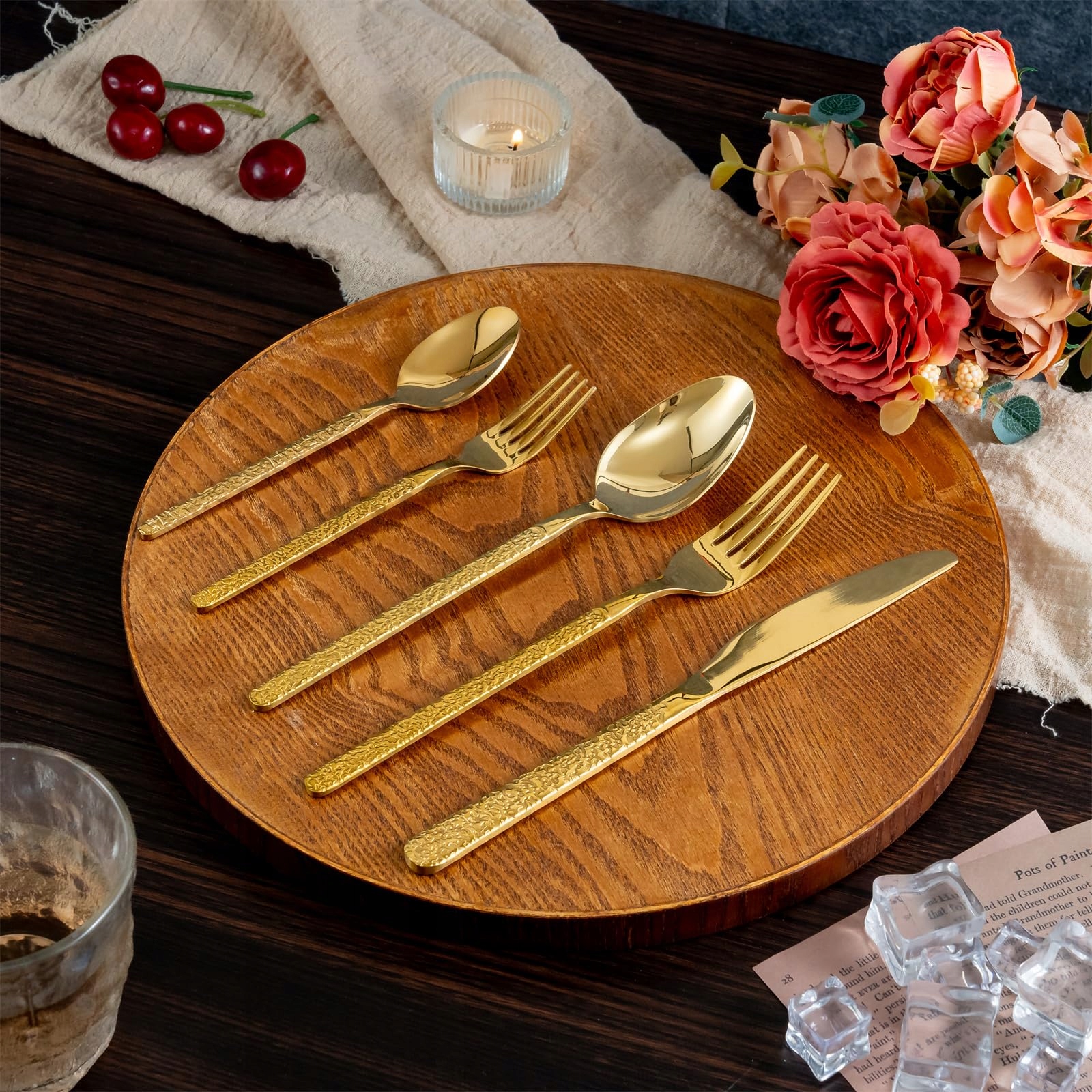 Wyjątkowe rzemiosło: Złoty zestaw sztućców został wypolerowany na wysoki połysk, gładka powierzchnia i wysoka polerka utrzymują sztućce w blasku. Gładkie krawędzie zapewniają komfort i nie zraniają ust. Uchwyt o średniej długości i wadze, który wygodnie leży w dłoni.