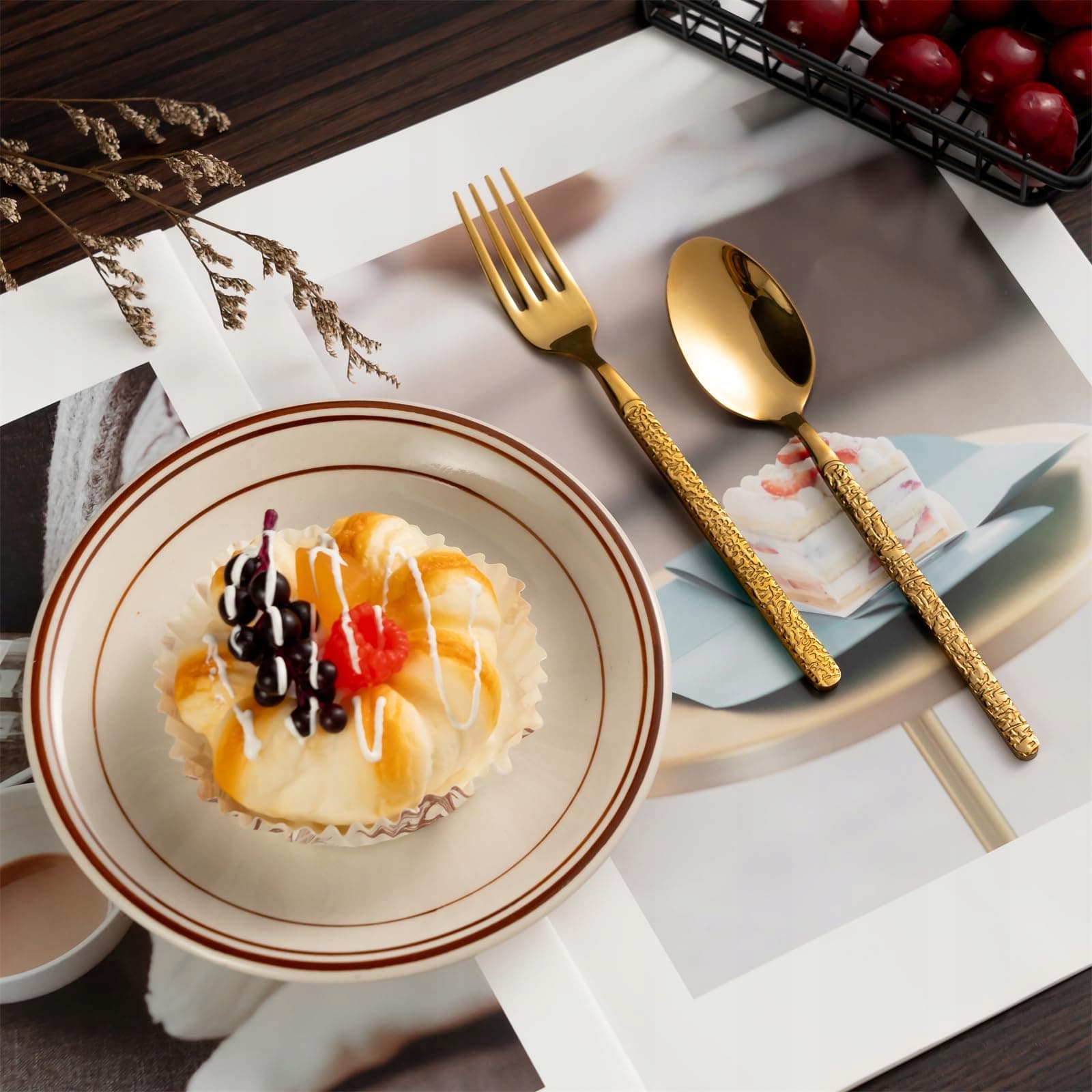 Design retro: Zestaw sztućców ze stali nierdzewnej w kolorze złotym posiada klasyczny i unikalny wzór rzeźbiony w kamieniu. Piękny wygląd elegancko dekoruje Twój stół, robi głębokie wrażenie na gościach i zapewnia komfortowe doznania podczas jedzenia.
