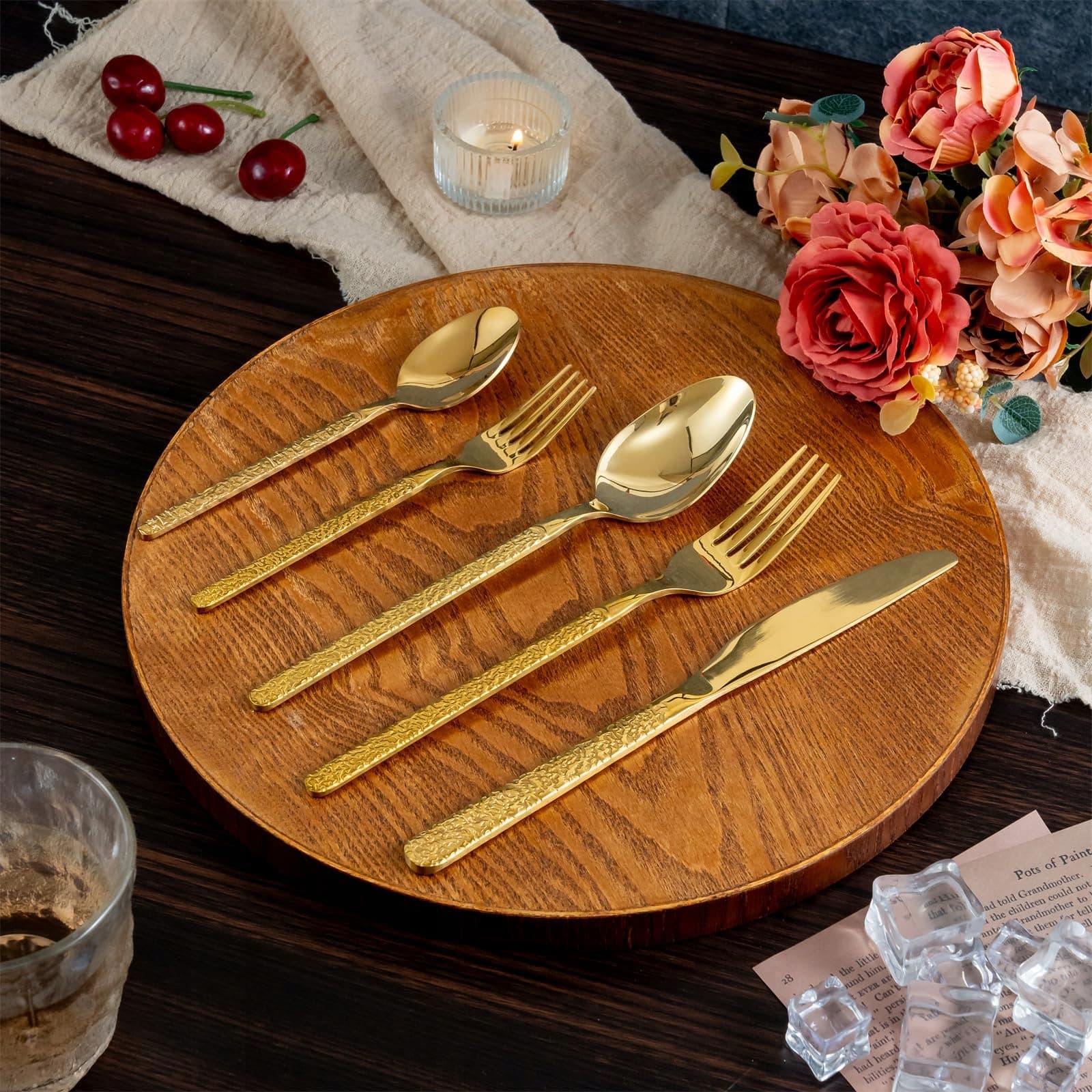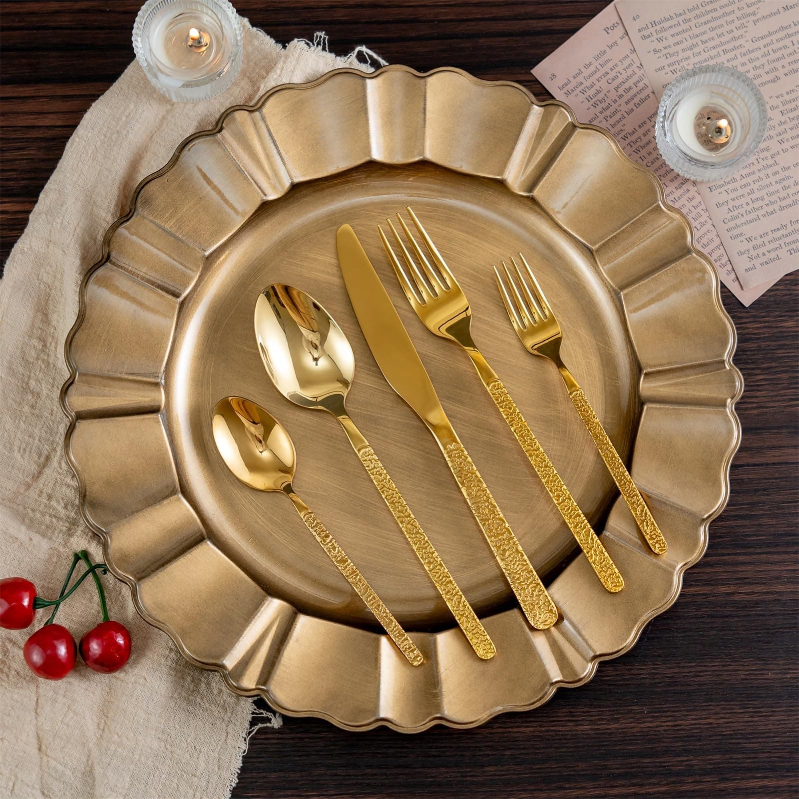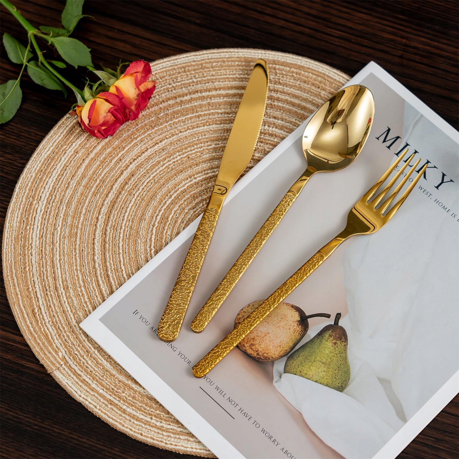 Design retro: Zestaw sztućców ze stali nierdzewnej w kolorze złotym posiada klasyczny i unikalny wzór przypominający rzeźbienie w kamieniu. Piękny wygląd elegancko dekoruje Twój stół, robi duże wrażenie na gościach i zapewnia komfortowe doznania podczas jedzenia.