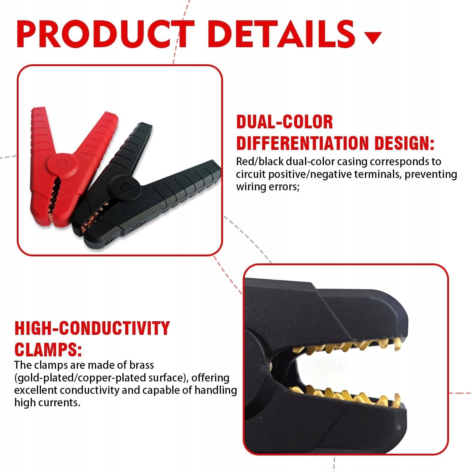 Praktyczny design zestawu: Zestaw zawiera łącznie dwa krokodylki, po jednym czerwonym i jednym czarnym, aby zapewnić bezpieczne i łatwe rozpoznawanie polaryzacji. To kodowanie kolorystyczne jest niezbędne dla intuicyjnego i bezbłędnego podłączania do akumulatorów samochodowych.