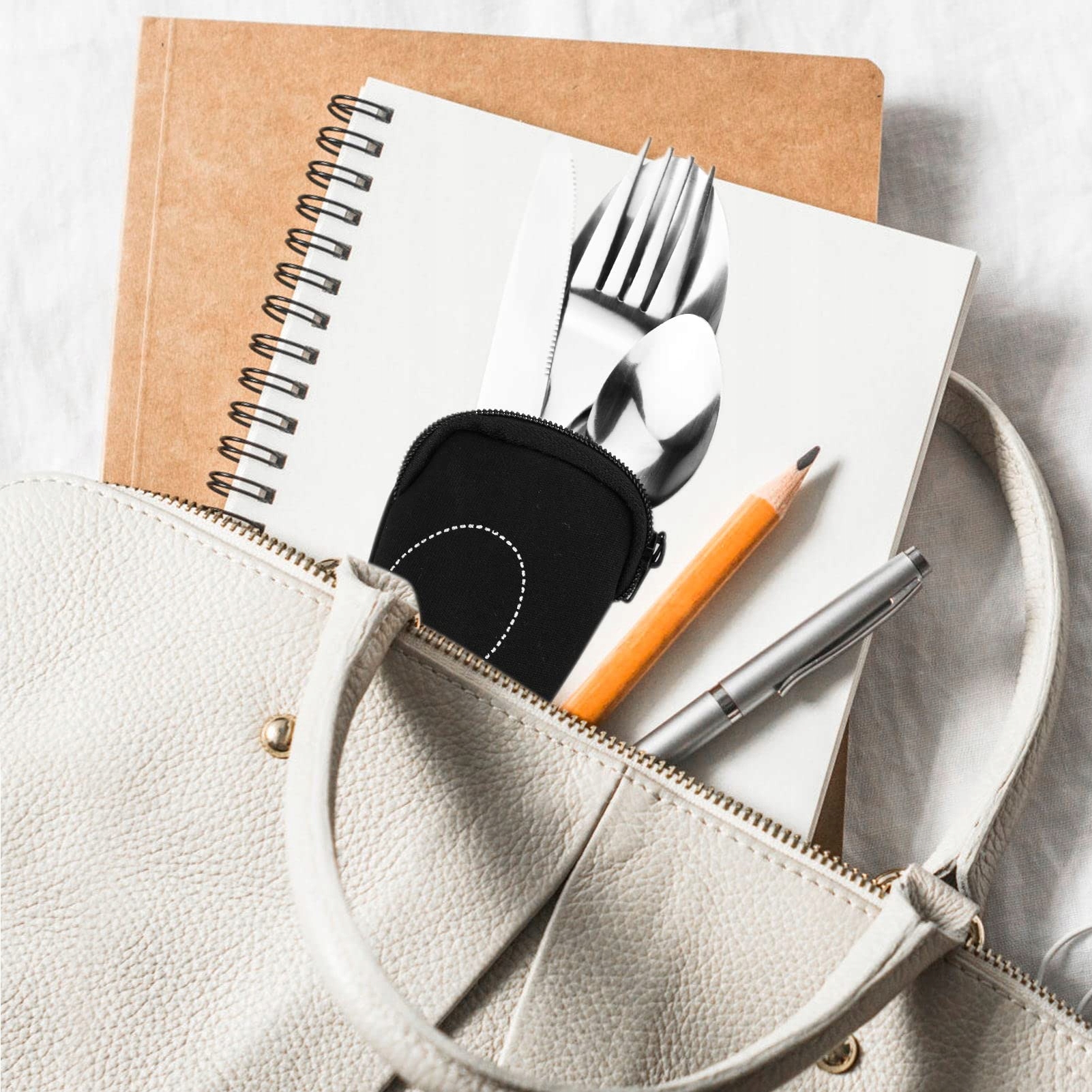 Zestaw sztućców z przenośną torbą, sztućce ze stali nierdzewnej, zestaw naczyń kempingowych z neoprenową torbą na zewnątrz, podróże, piknik, biuro, szkoła, lunchbox, 4-częściowy