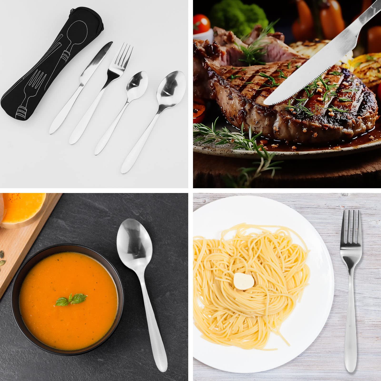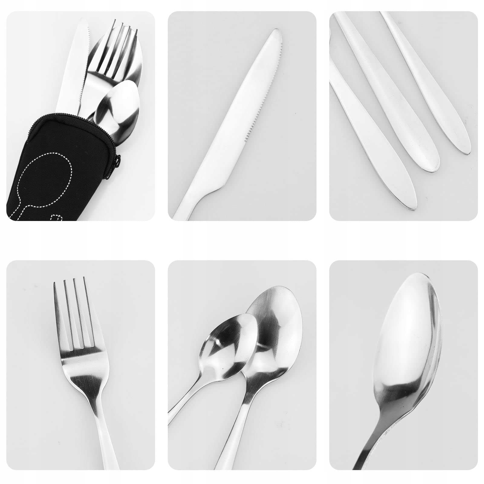 【Zawartość opakowania】 Po otrzymaniu paczki otrzymasz 1 nóż, 1 widelec, 1 łyżkę, 1 łyżeczkę i 1 etui na zamek błyskawiczny. Wystarczająca ilość, aby zaspokoić Twoje codzienne potrzeby. Praktyczne dopasowanie do codziennego stołu rodzinnego i imprez na świeżym powietrzu.