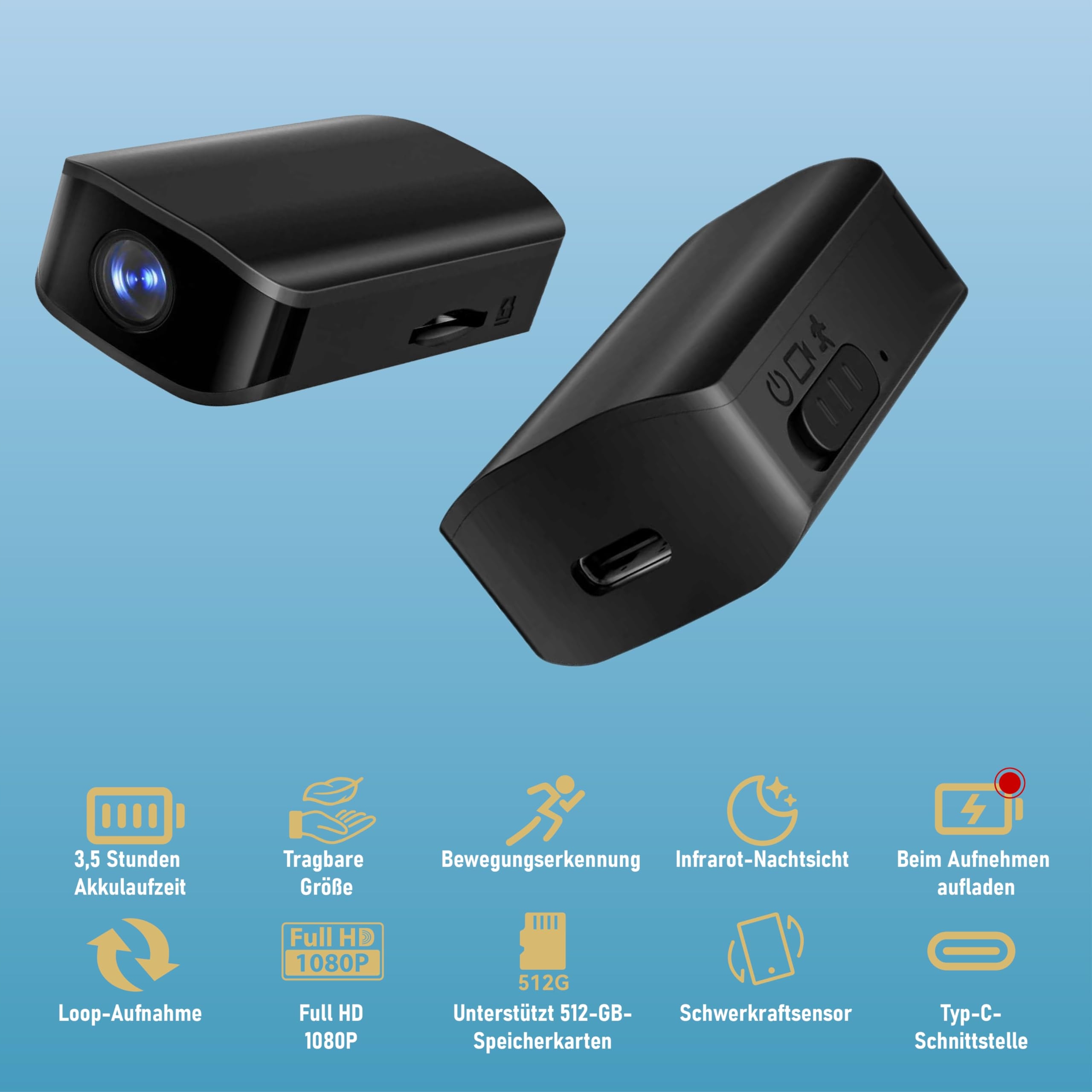 Nagrywanie wideo HD: Ten rejestrator wideo ma rozdzielczość 1920×1080 pikseli, co umożliwia nagrywanie w jakości HD. Obsługuje karty Micro-SD 16G-512G (karty nie są dołączone, muszą być dostarczone przez użytkownika).