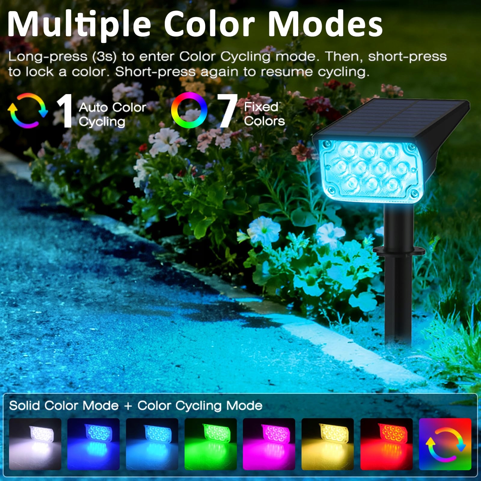 ---7 zmiana kolorów, 2 tryby kolorów: Przytrzymaj przycisk włączania/wyłączania przez 3 sekundy, aby włączyć lampę solarną do ogrodu i przejść do trybu zmiany kolorów. Ta lampa solarna do ogrodu startuje w trybie zmiany kolorów (czerwony-zielony-niebieski-błękitny-żółty-zielony-fioletowy-biały). Krótkie naciśnięcie przycisku włączania/wyłączania pozwala zapisać wybrany kolor.