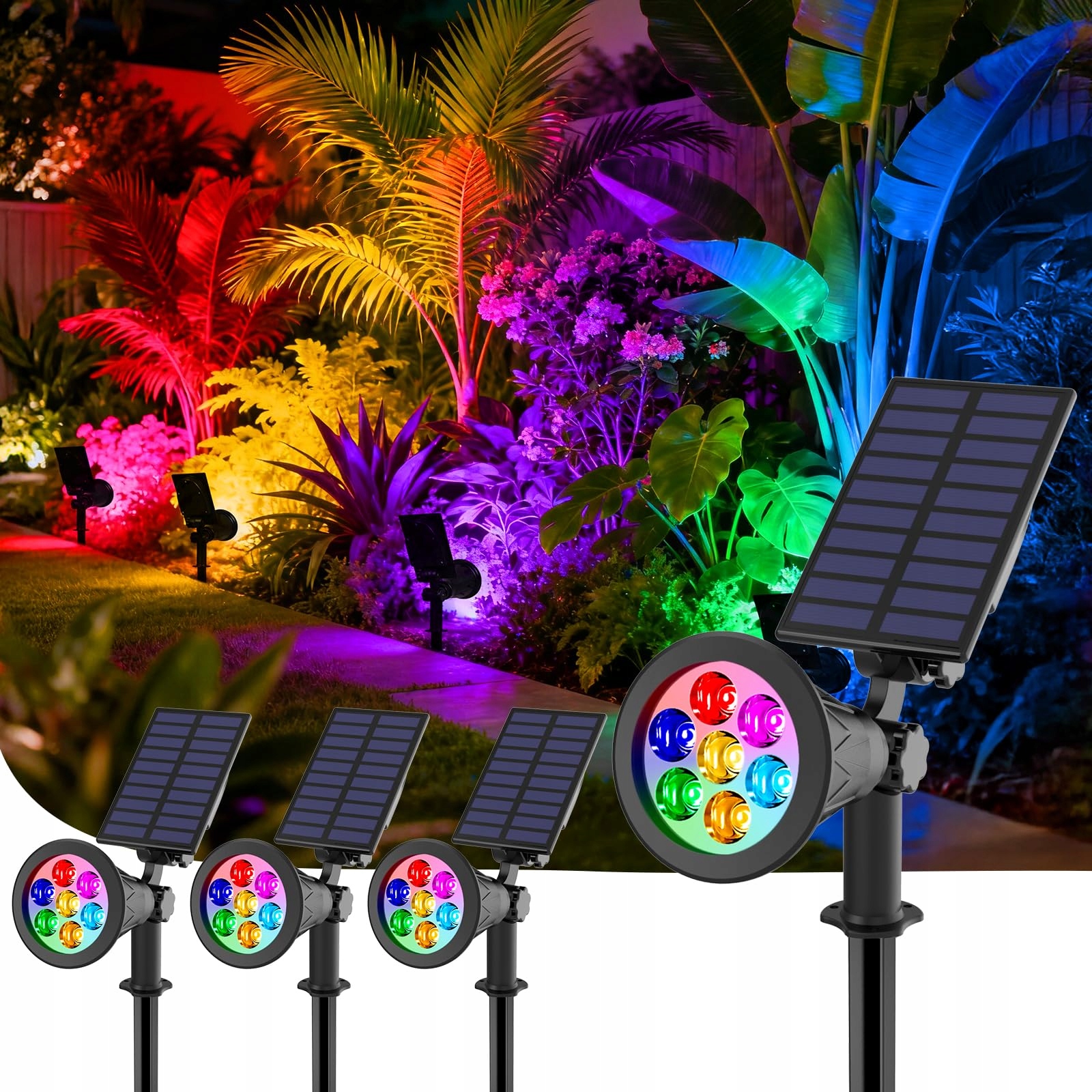 T-SUNUS Solarny reflektor ogrodowy wielokolorowy, reflektor solarny na zewnątrz RGB, kolorowa lampa ogrodowa solarna, wodoodporny IP65 z 7 zmianami kolorów do drzew, tarasu, ścieżki ogrodowej, trawnika, 4 sztuki