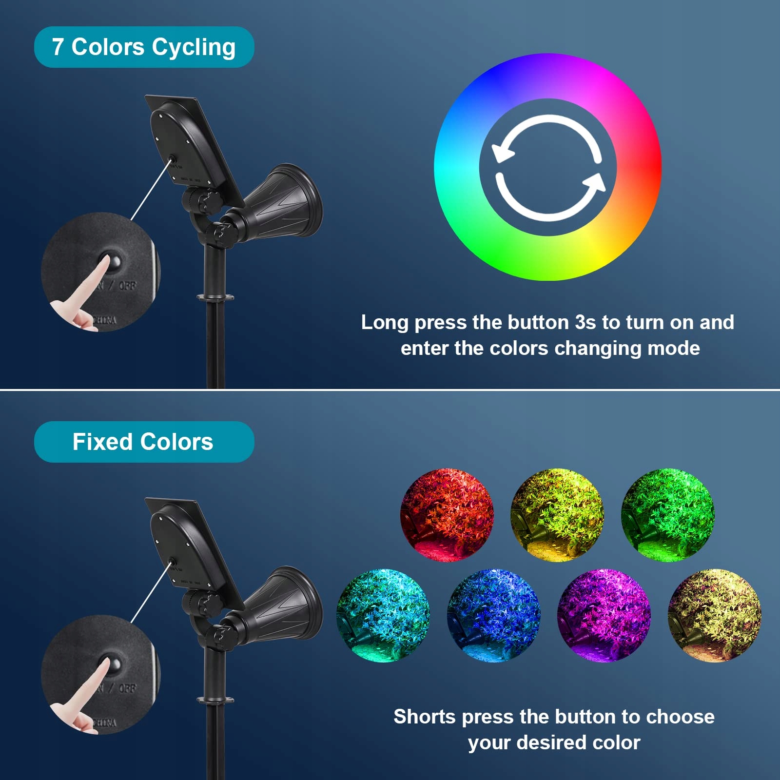 💙 7 zmian kolorów i 2 tryby kolorów: Te solarny reflektory T-SUNUS na zewnątrz RGB mają dwa tryby. Tryb 1: Naciśnij długo co najmniej 3 s – włącza się i przechodzi w tryb zmiany kolorów, automatycznie zmienia kolor co trzy sekundy. (Czerwony→ Zielony→ Niebieski→ Żółty→ Cyjan→ Fioletowo-żółty) – Tryb 2: Krótkie ponowne naciśnięcie, aby przejść do stałych kolorów, stały tryb kolorów dla wybranego koloru.