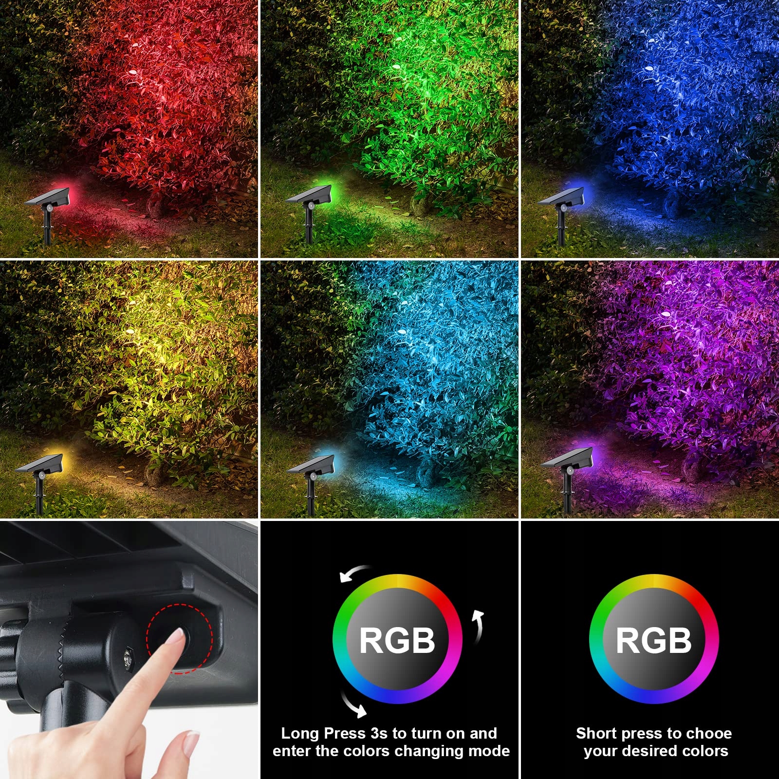 【6 zmiana kolorów 2 tryby kolorów】 Przytrzymaj przycisk, aby włączyć lampę ogrodową solarną. Tryb 1: automatycznie zmienia kolor co trzy sekundy. Tryb 2: naciśnij przycisk, aby zablokować kolor.