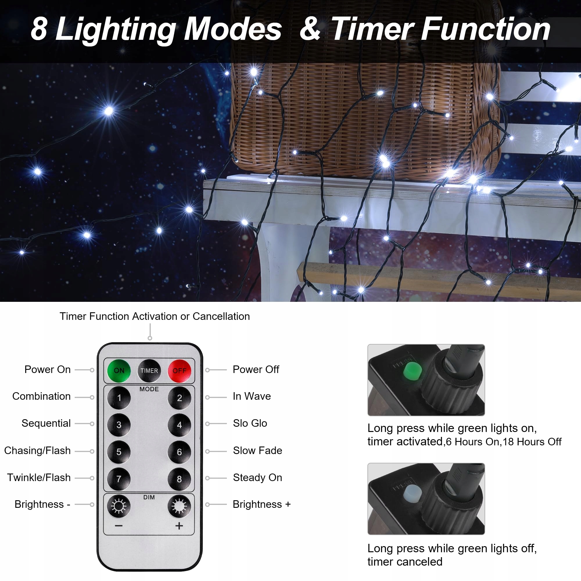 🎄 8 trybów i ściemnialny: Oświetlenie świąteczne na zewnątrz dostępne jest w 8 trybach oświetlenia. Naciśnij przycisk DIM+/-, aby ustawić jasność.
