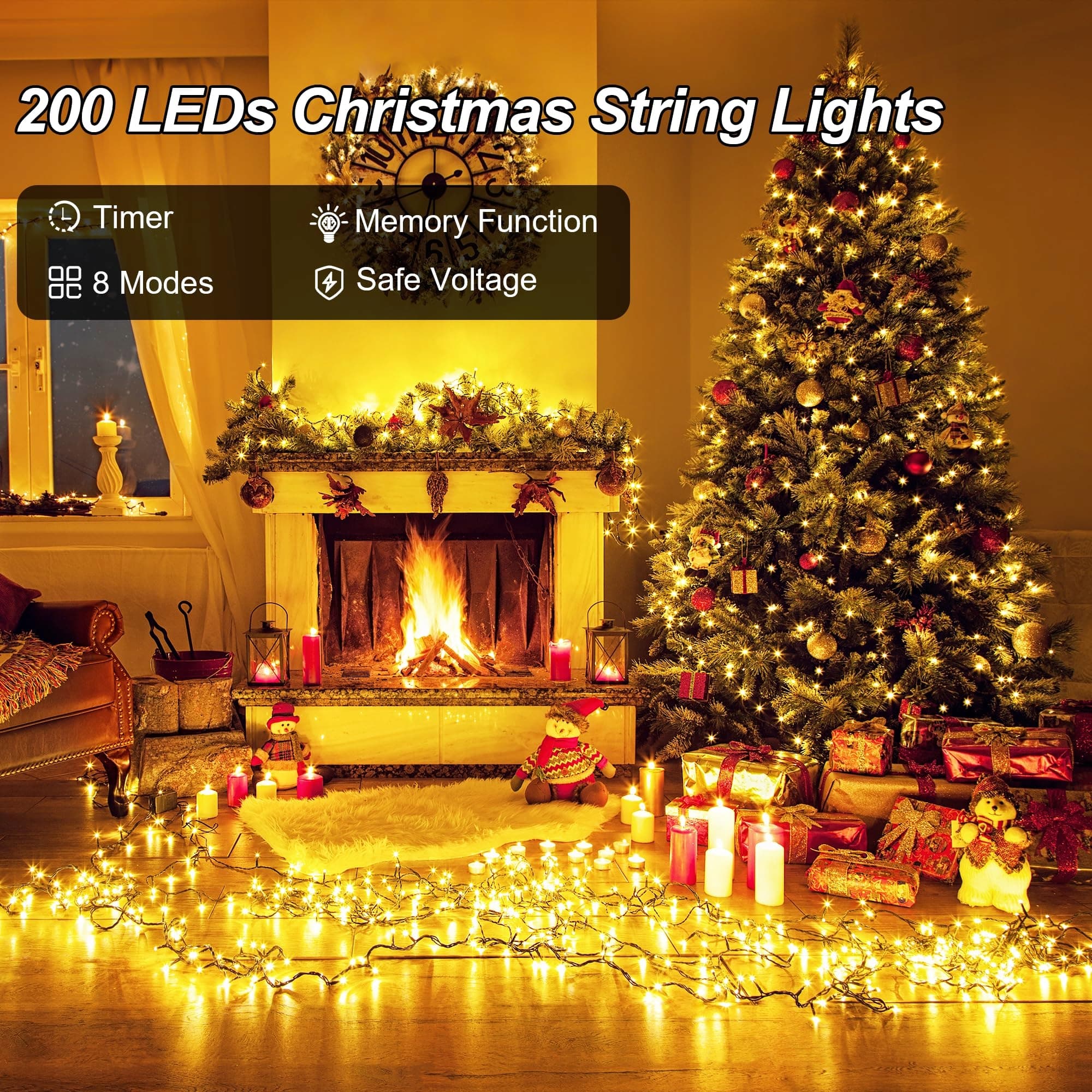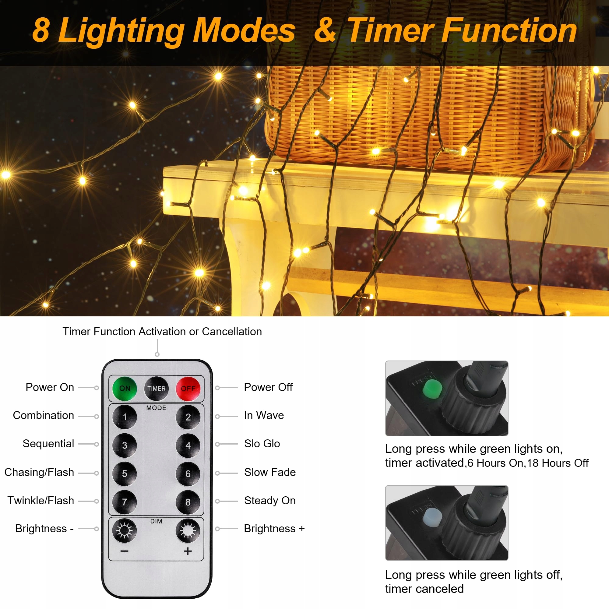 🎄 Timer i funkcja pamięci: Naciśnij i przytrzymaj przycisk na adapterze lub naciśnij 'TIMER' na pilocie, funkcja timera działa, gdy światła na adapterze stają się zielone, łańcuch świetlny na Boże Narodzenie automatycznie włącza się na 6 godzin, a następnie wyłącza na 18 godzin codziennie, bez konieczności ręcznego włączania i wyłączania każdego dnia.